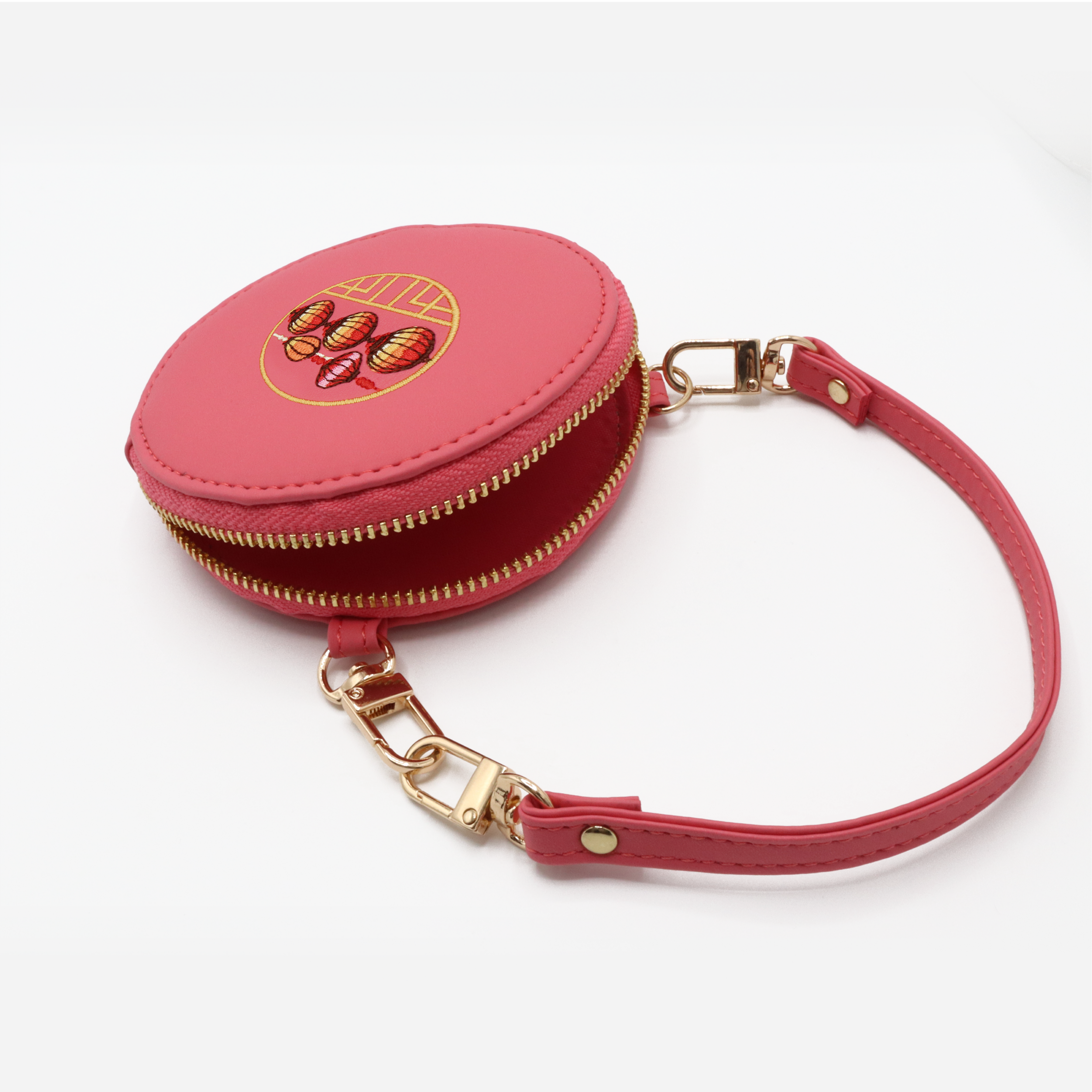 ・コロンと丸い形に、刺繍でランタンのデザインを施した丸型ポーチは、ストラップつきで
