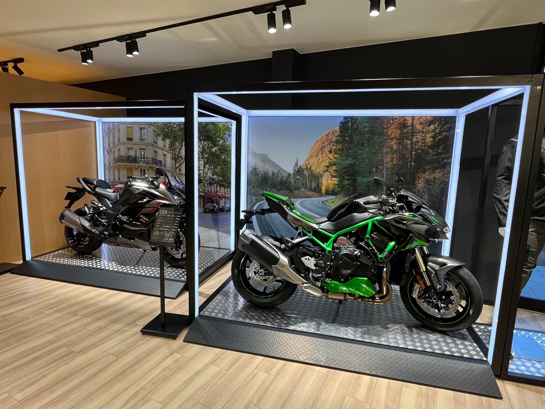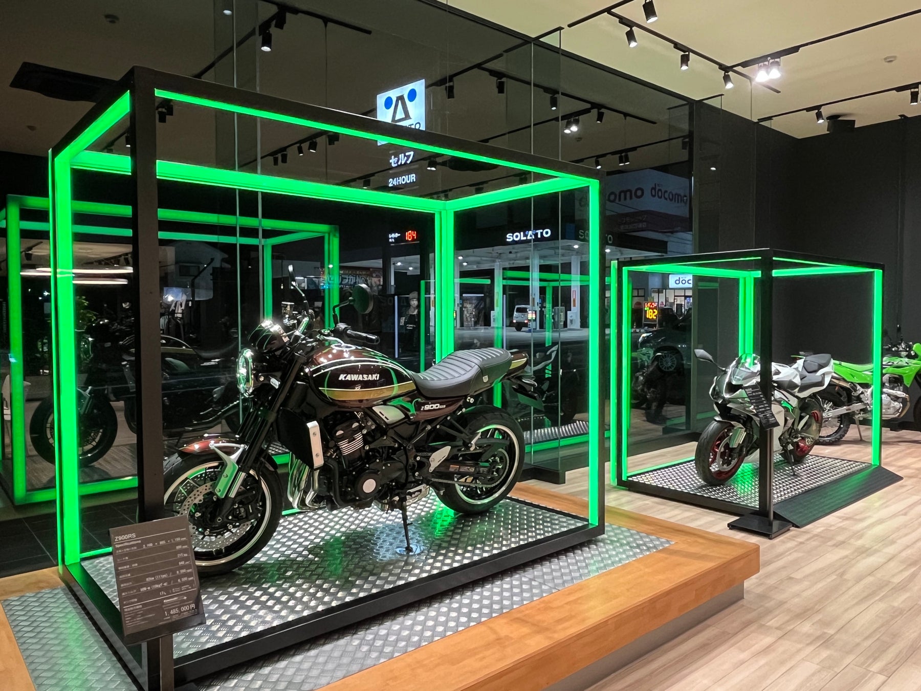 新たなオーナーを待つモーターサイクルたちが、ケージの中で静かに眠りについているイメージを光の枠で創出。カワサキ プラザならではのアイコニックポイントの一つです。