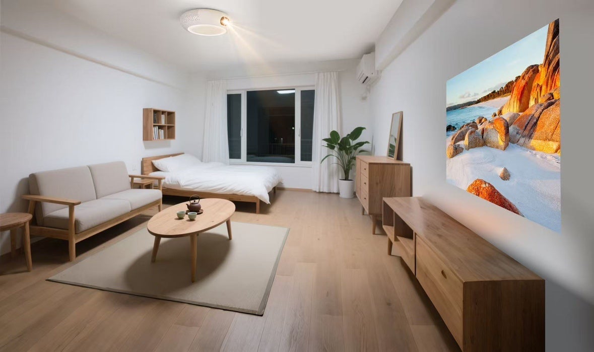 照明器具として部屋全体を明るく照らしながら、最大120インチの大画面映像を投影することが可能です。照明・映像・音響が一体となった新しい空間体験を寝室やリビングで手軽に楽しむことができます。