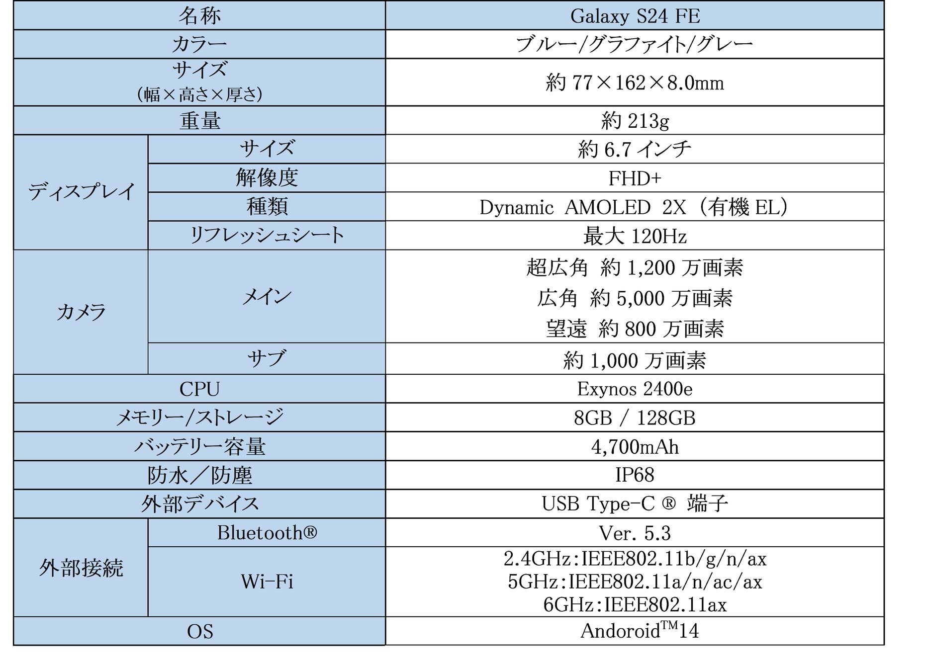 <主な仕様:「Galaxy S24 FE」>