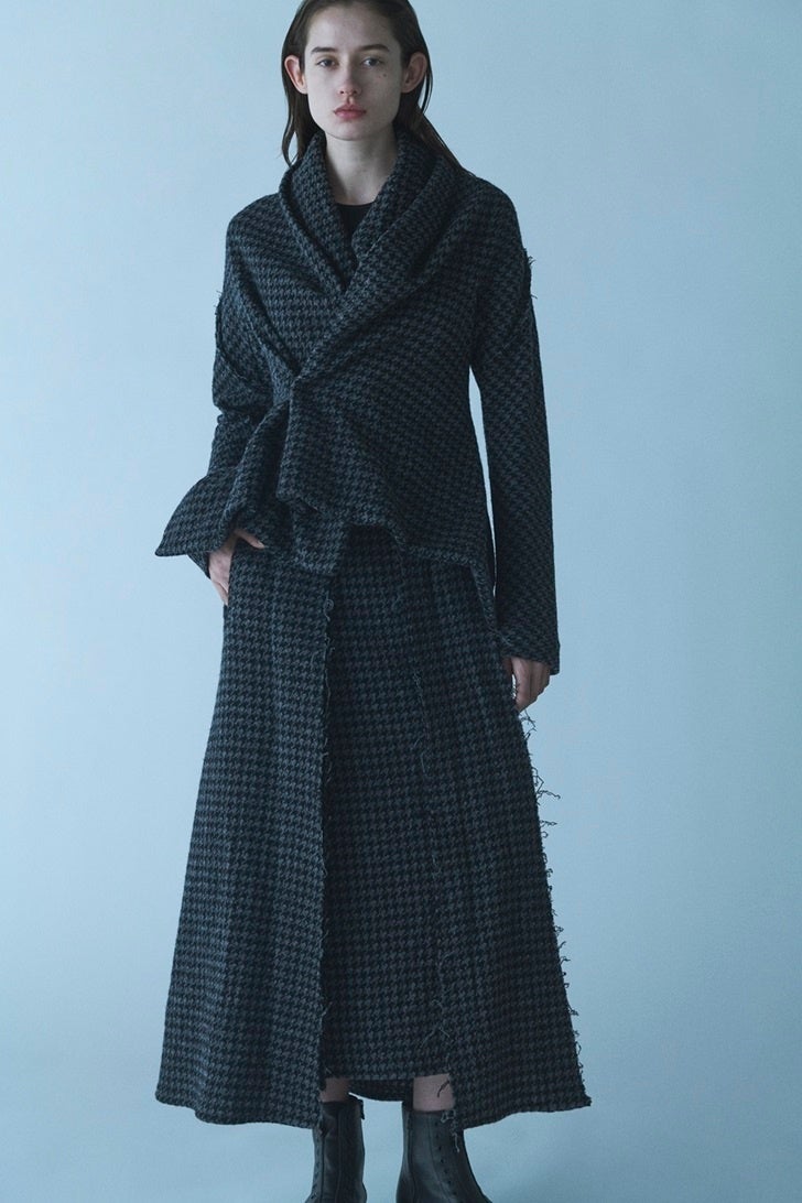 滑らかな肌触りのメルトン生地が形作る、シーズンを象徴する立体、花瓶のような襟元、ストールの流れが美しいアウターや、ホワイト、グレー、ブラックのモノクロームな色合いで構成された、様々なサイズの千鳥格子に、細かな色彩のツイードのセットアップなど、バリエーション豊かなラインナップが揃います。