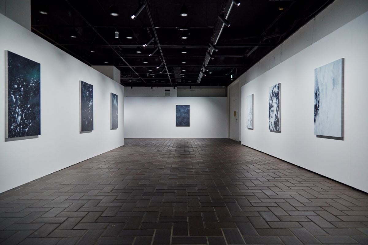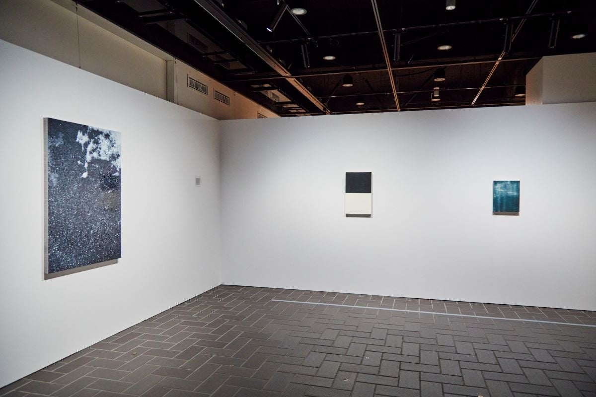 本展では根室の風景をモチーフにした油彩とアルミニウムパネルを氷に見立てた新作の《結氷》を展示している。