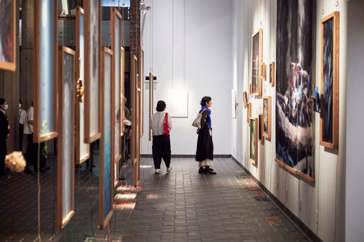 布地に印刷された写真には、家族の一員であるアイヌ犬のウパシとの暮らし、知床の風景など川村の日常がとらえられている。北海道産の木製のフレームに額装されたそれら写真は、アウトドアキャンプ用のロープで吊り下げられ展示空間を構成している。環境に配慮し、美術館の建築に敬意を払い、作品展示のために新たに壁を立てることはしていなかった。作品同士が空間に心地よく配置されている様子は鑑賞者の目にも新鮮だろう。この木製の額縁は折り畳み可能。すべて作家自身が車に詰め込んで会場まで運び、展示されている。展覧会終了後は、また折り畳み、知床まで戻るそうだ。これも生活と制作、展示の連続性を大事にする川村のいう行為としてのプロセスなのだろう。