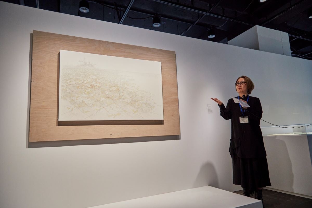 「誰もいない、誰も来ない深い森の中で突然現れた風景に驚き、喜びと、恐怖も感じたことを覚えています」という榎本の言葉を大橋学芸員が伝え、積もった白い雪––榎本が出会った自然をみずみずしい感性でとらえた作品であると紹介した。白黒にシンプルに削られた作品だからこと、見る人が自分の記憶と結び付け自由に想像を広げる余白をもっている。