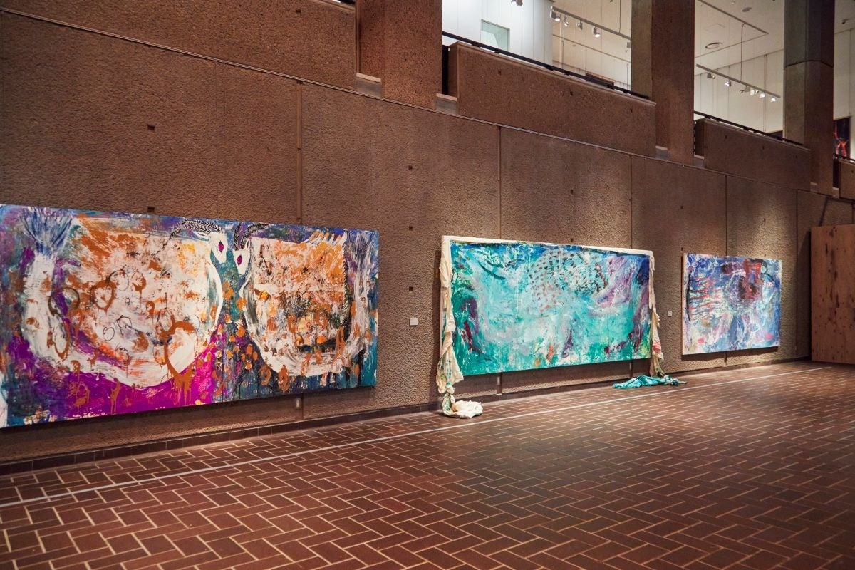 ひとつ下の階(ギャラリーA)の吹き抜け展示室にはミロコマチコの勢いのある作品世界が広がる。大阪府生まれのミロコマチコは、11年にわたる東京での活動を経て、2019年奄美大島に移住した。展示空間の中央には《島》がつくられ、その周りには奄美大島で制作された作品が多く展示されている。