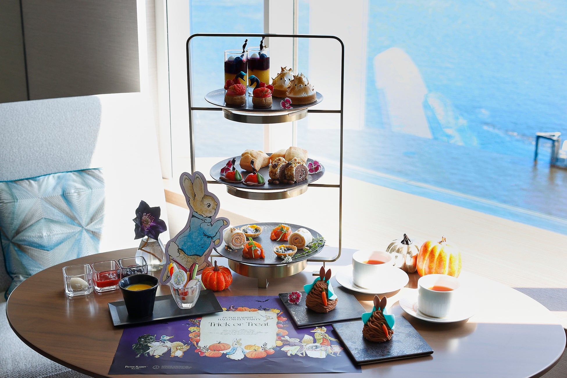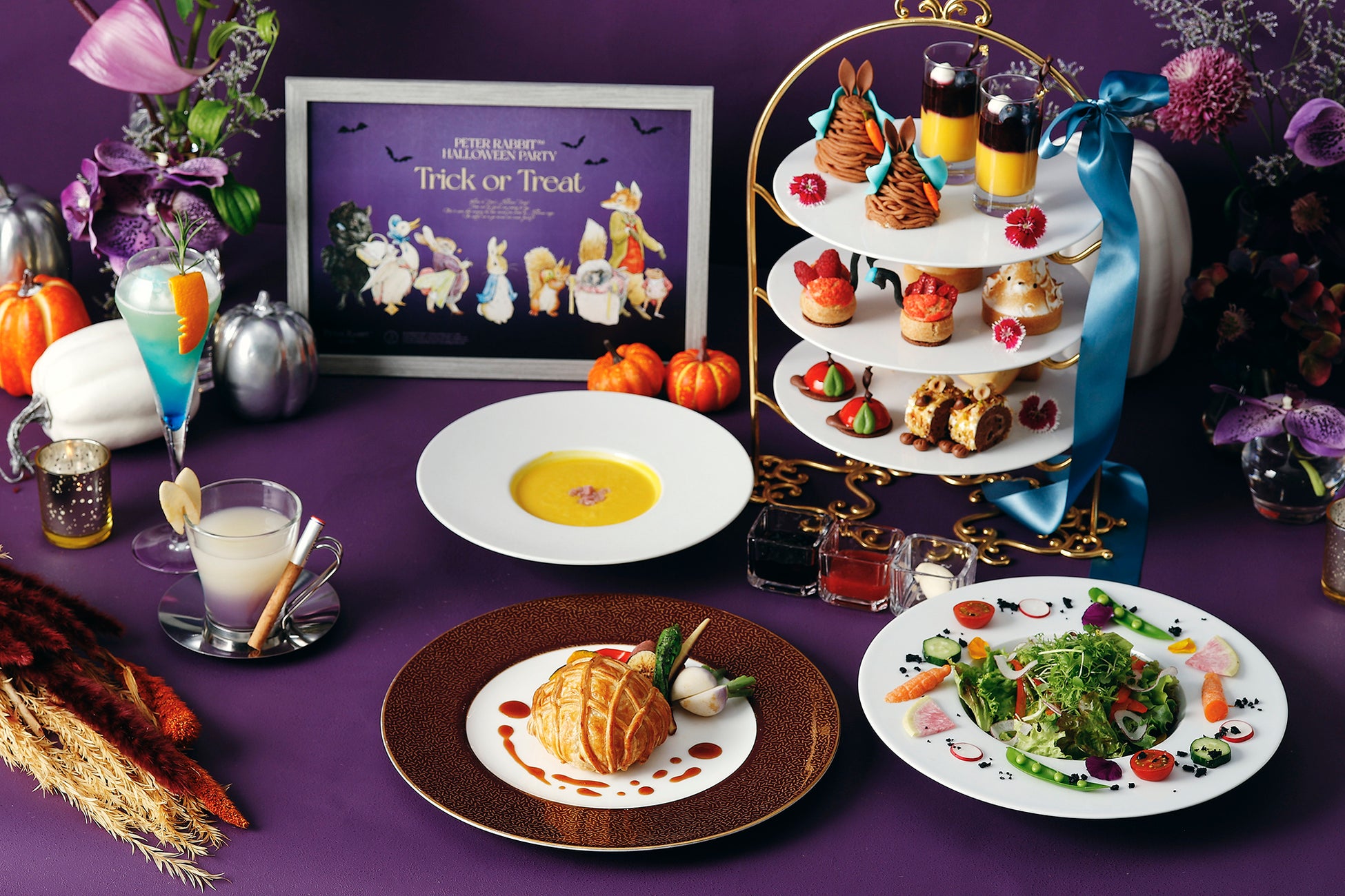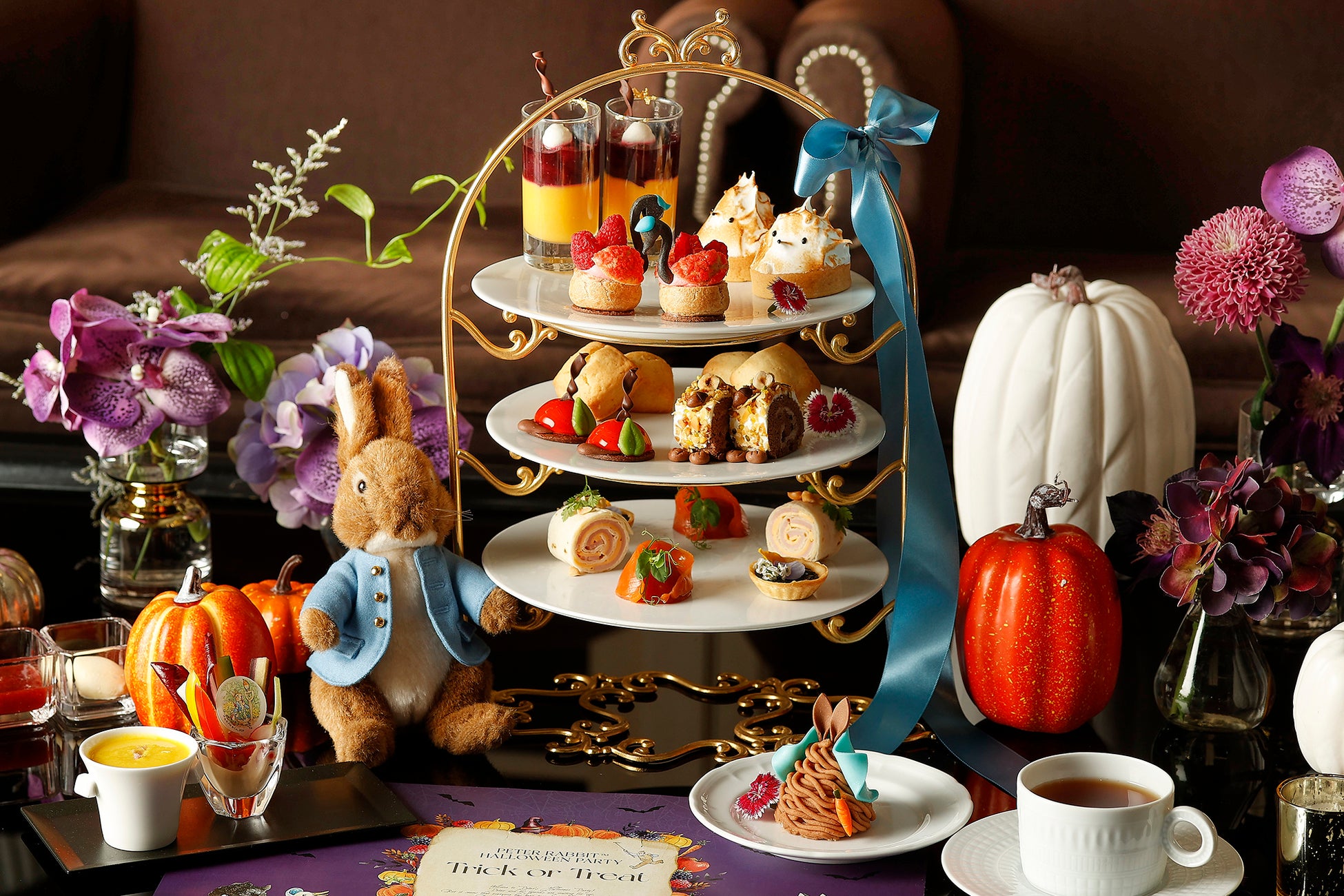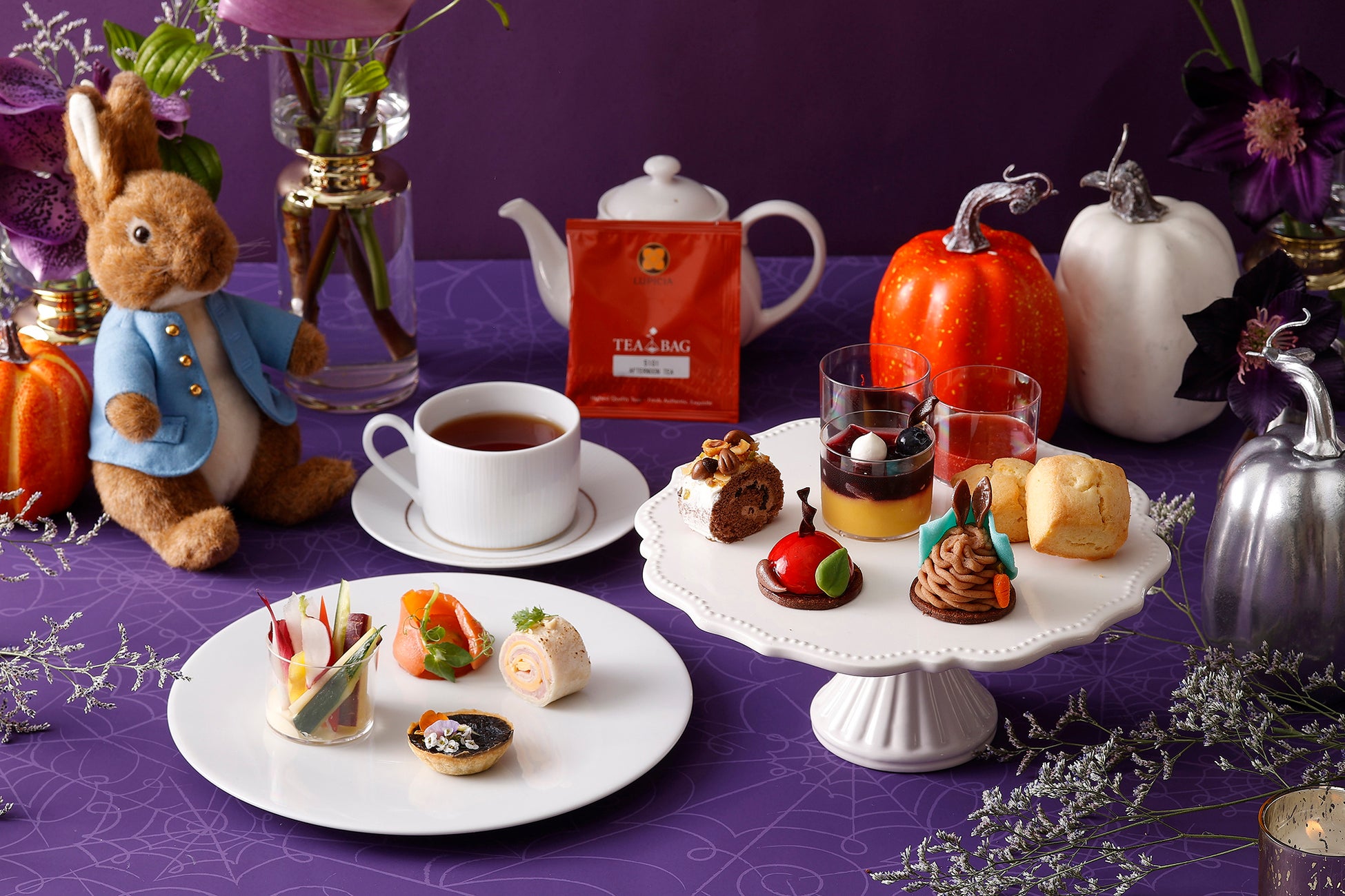 イベントは9月19日と10月23日に各回限定8組の予約制で、ピーターラビットと撮影をお楽しみいただけます。「Trick or Treat」と伝えるとオリジナルギフトをプレゼント。ピーターラビットが描かれたオリジナルマカロンと、記念写真をオリジナル台紙に入れてご用意いたします。撮影のあとは、ピーターをはじめその仲間たちをモチーフにし、秋の味覚の栗やモンブラン、リンゴなどをアレンジしたスイーツやセイボリーを揃えたハロウィンアフタヌーンティーをご堪能いただけます。さらにテーマカラーの紫色のアイテムを身に着けてお越しいただくと、より世界観をお楽しみいただけるイベントとなっております。
