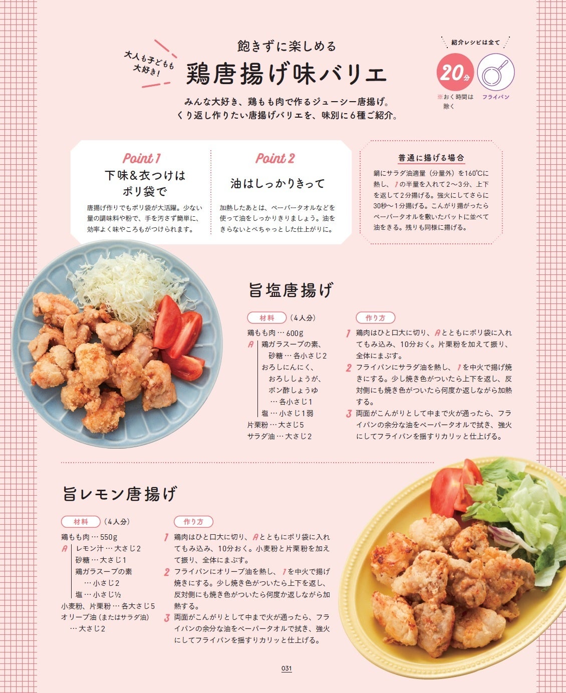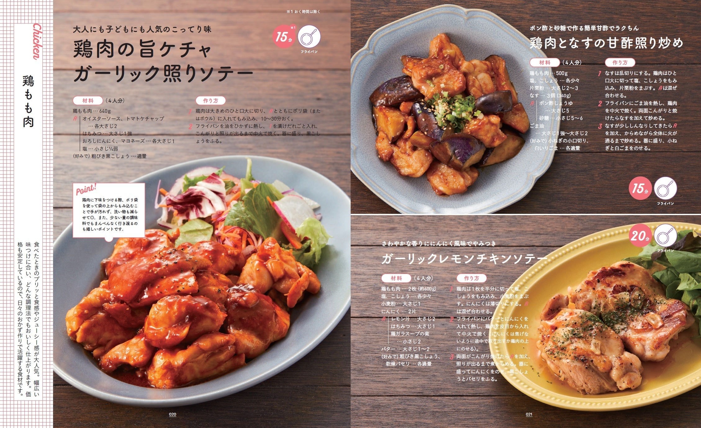 主材料が2つでできるおかずや失敗知らずのレンチンおかずなど、料理がラクになるレシピコラムが充実。そのほか、唐揚げバリエーション、肉巻きバリエーションなど、マンネリを防いでくれるレシピアイデアもたっぷり紹介しています。