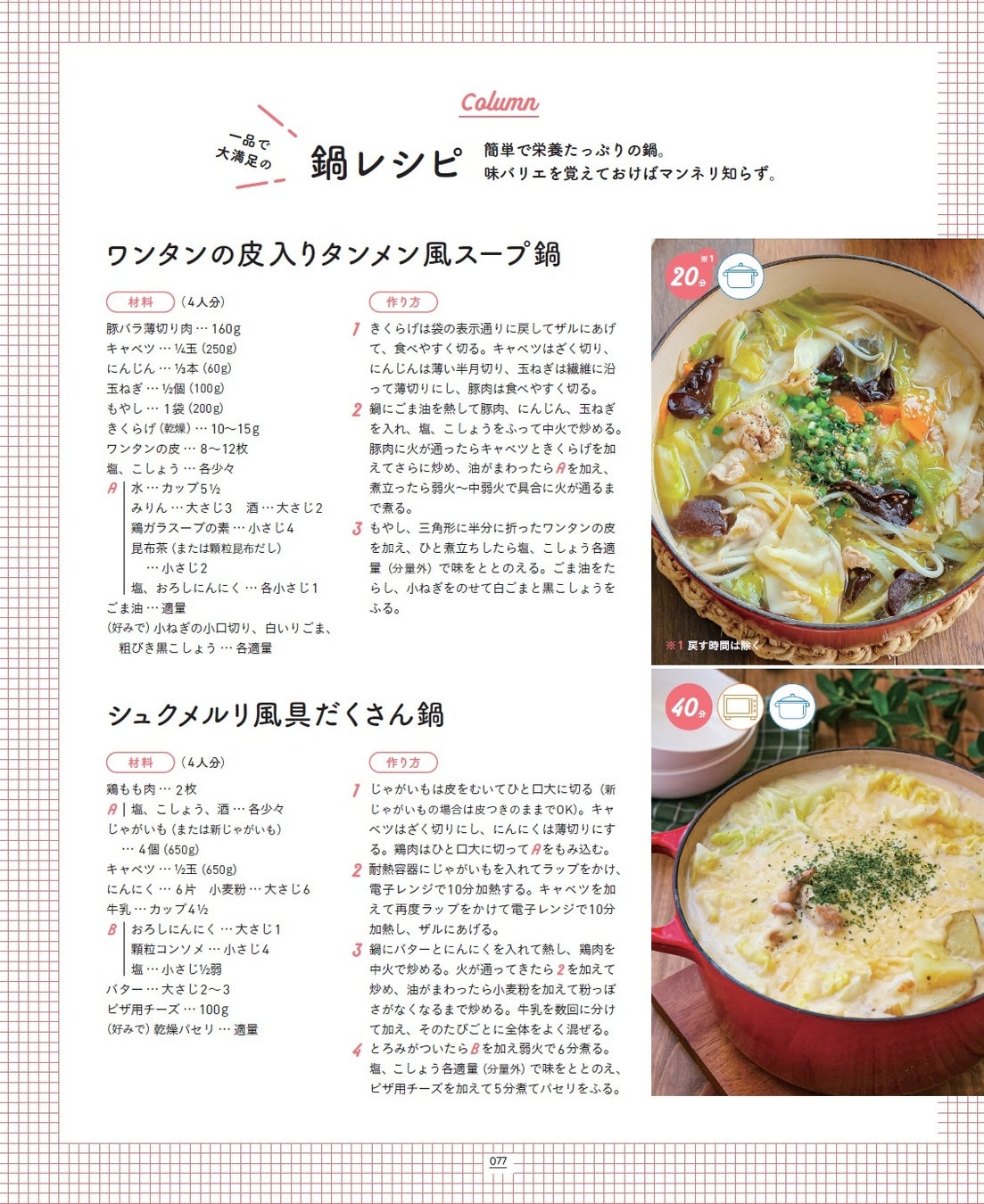 またInstagramやNadiaで大人気の鍋レシピもたっぷり掲載! 松山さん自身、「鍋は野菜もたんぱく質もとれる便利なおかず」とおすすめしています。鍋だれや鍋つゆのバリエーションもたっぷりあるので、飽きずに手軽な鍋レシピを楽しめます。
