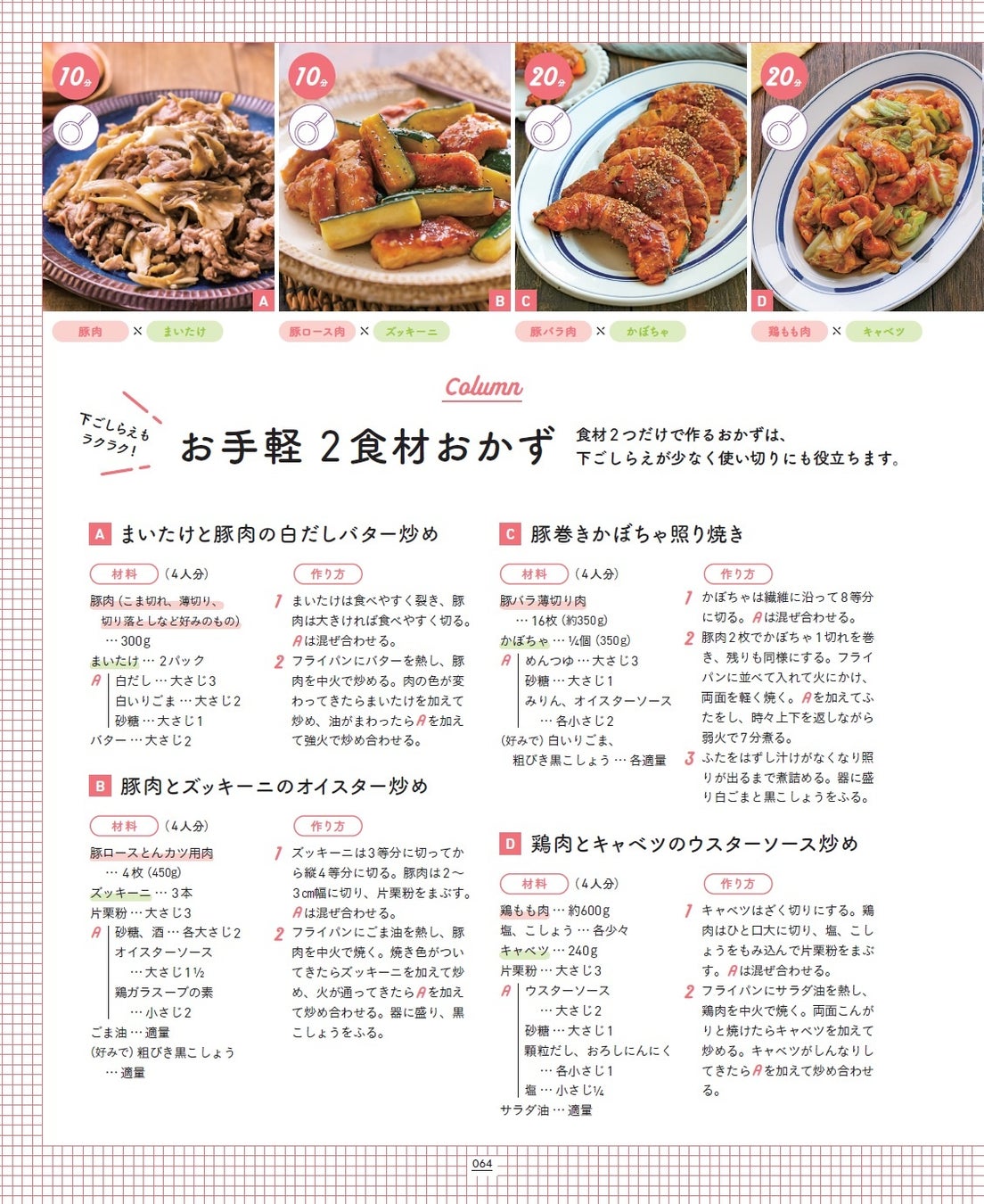 主菜は材料順にレシピを掲載。鶏もも、鶏むね、豚こまといった定番レシピから、砂肝やレバーなどちょっとニッチな食材までしっかり網羅しています。今日冷蔵庫にある食材や、スーパーの特売の食材でできるレシピが必ず見つかります。