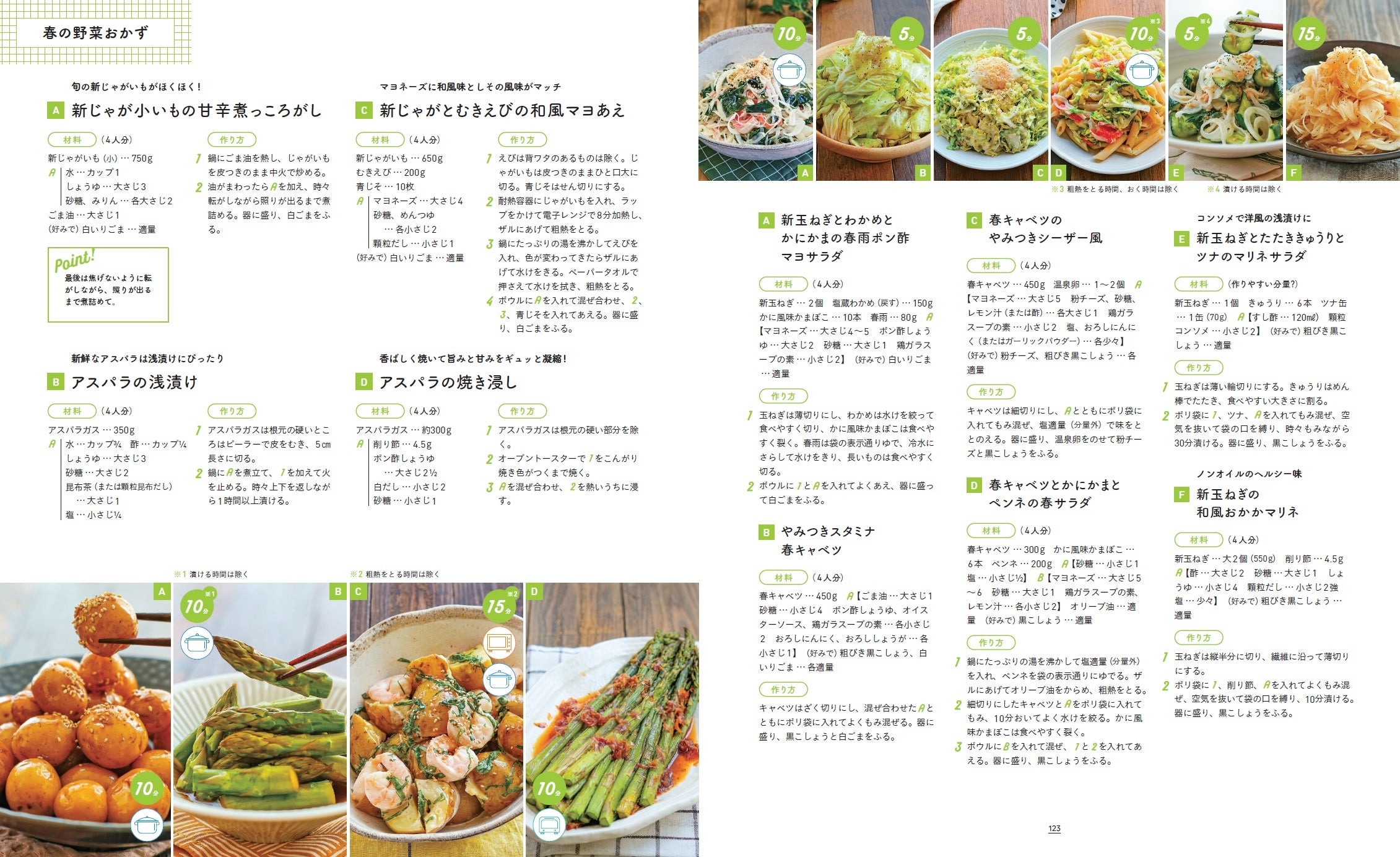 副菜は季節ごとにレシピを掲載しています。旬の野菜を食卓に取り入れると季節感が出るだけでなく、なにより節約の近道に! そのほか豆腐や乾物など一年中作れる副菜も紹介しています。
