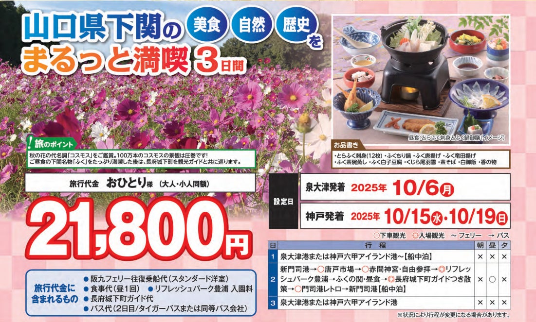 【阪九フェリー関西発団体ツアー】とらふくをご賞味!山口県下関の「美食」「自然」「歴史」をまるっと満喫3日間販売開始!