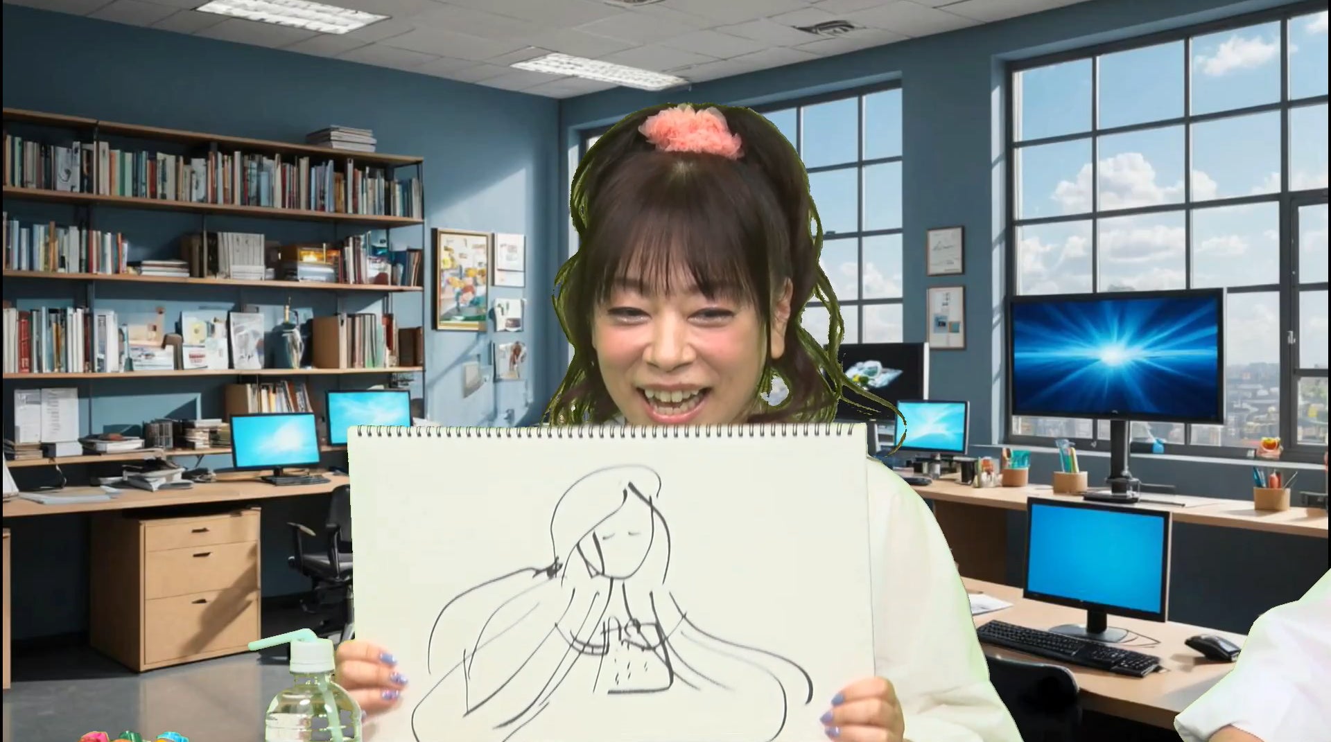 その後、告知タイムをかけてゲーム「イラストラボラトリー!」にチャレンジ。制限時間30秒で、お題の絵をフルカラーで描き、当て合うというゲームです。正解するごとに告知タイム5秒をゲットできます。先攻はKOTOKO。「紫式部」という難題に対し、特徴を捉えた分かりやすいイラストを披露し、見事May'nが正解!幸先の良いスタートを切ります。