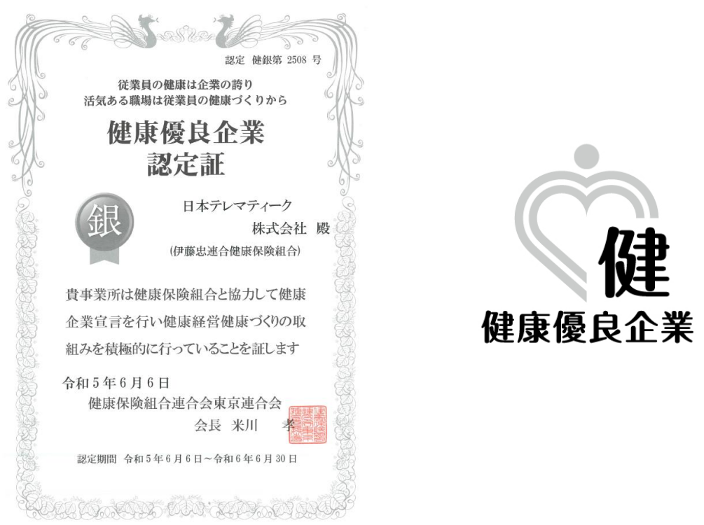 日本テレマティーク株式会社(本社:東京都渋谷区、代表取締役社長:宮園昌明)は、健康保険組合連合会東京連合会に「健康企業宣言」を行い、健康経営に向けた職場の健康づくり及び環境整備などの積極的な取組みが評価され、2023年6月6日、健康優良企業の証として「銀の認定」を受けました。