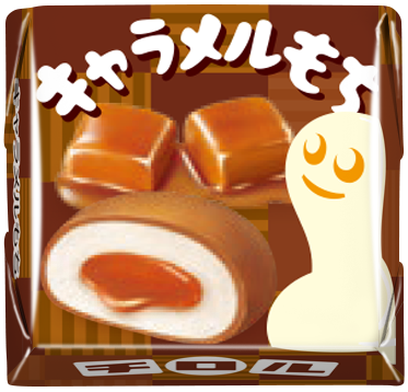 パッケージには、キャラメルの四角をモチーフにした格子模様を背景に、人気キャラクターのもちくんが描かれています。