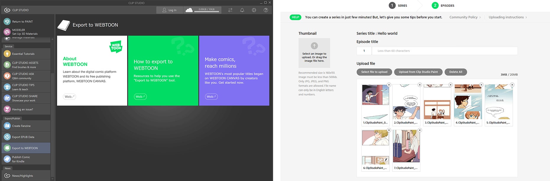 (左:英語版のCLIP STUDIOから「Export to WEBTOON」を選択可能。右:WEBTOON CANVASの公開画面)