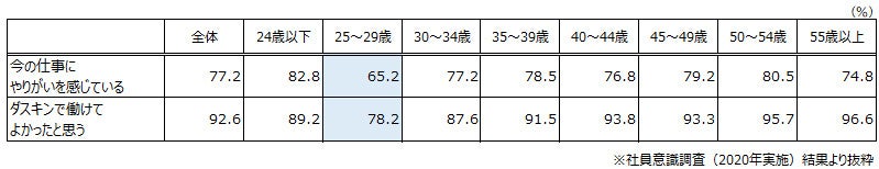 社員意識調査において、「今の仕事への満足度」は全体平均で約8割、「ダスキンで勤務することに対する満足度」も9割以上と高い数値となっていますが、他の年齢層と比較し業務に慣れ始めた20代後半では低い結果となっています。