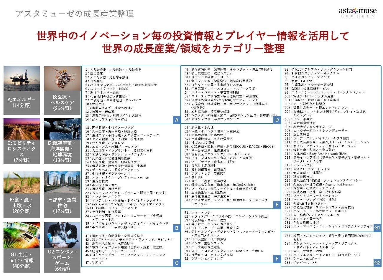 アスタミューゼ株式会社(本社:東京都千代田区、代表取締役社長:永井 歩)は、企業の中期経営計画や新規事業戦略策定を支援する「有望成長領域レポート」を、従来の136分野から138分野にアップデートし、最新版の提供を開始いたしましたのでお知らせいたします。
