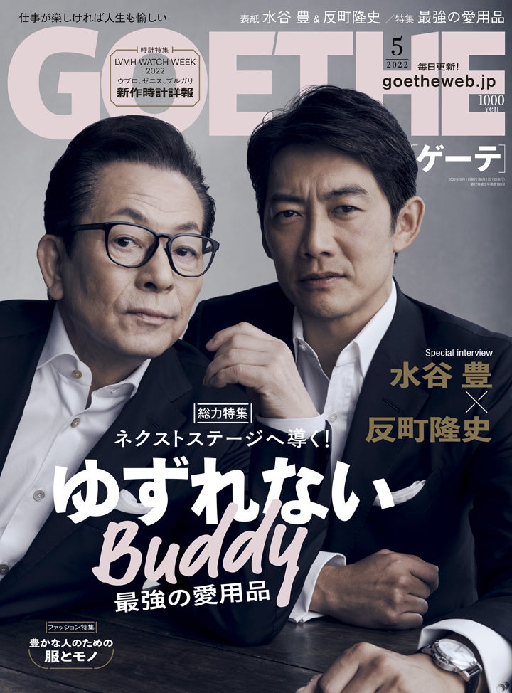 仕事に遊びに一切妥協できない男たちが、人生を謳歌するためのライフスタイル誌[ゲーテ]5月号が3月25日に発売となる。最前線で躍進し続けるエグゼクティブたちが愛用する最強の相棒を徹底取材。そのほか、お互いを「最高のバディ」と称する水谷豊と反町隆史のスペシャルインタビューや、ファッション特集も必見!