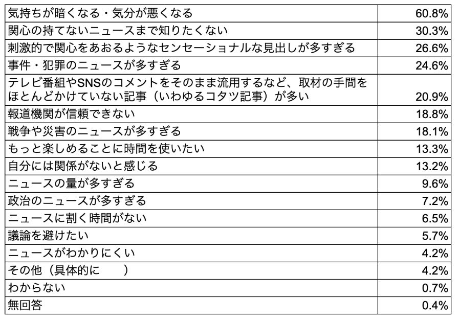 「頻繁に」「時々」「たまに」ニュースを避けることがある、と答えた人に対して、ニュースを避ける理由について尋ねたところ(複数回答可)、「気持ちが暗くなる・気分が悪くなる」と回答した人が61%でトップでした。2番目に多かったのは「関心の持てないニュースまで知りたくない」(30%)、ほかに2割を超えた回答としては、「刺激的で関心をあおるようなセンセーショナルな見出しが多すぎる」(27%)、「事件・犯罪のニュースが多すぎる」(25%)が続きました。「テレビ番組やSNSのコメントをそのまま流用するなど、取材の手間をほとんどかけていない記事(いわゆるコタツ記事)が多い」(21%)となりました。