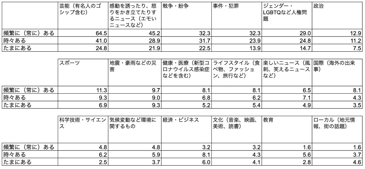 避けたいニュースジャンルとして、「戦争・紛争」(19%)を上回って「芸能(有名人のゴシップ含む)」(22%)が挙がったり、「感動を誘ったり、怒りをかき立てたりするニュース(エモいニュースなど)」(18%)の割合も高かったことは興味深い。「戦争・紛争」が報道メディアにとって避けられないジャンルである一方、他の2つは、選択することができるからである。