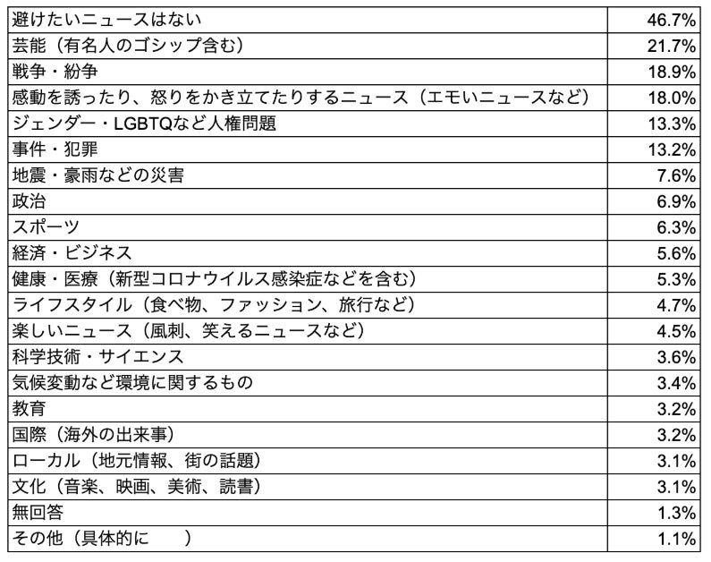 「避けたいニュースはない」とする回答が一番多く47%でしたが、ジャンル別にみて「避けたい」割合が最も高かったのは、「芸能(有名人のゴシップ含む)」(22%)、次いで「戦争・紛争」(19%)、「感動を誘ったり、怒りをかき立てたりするニュース(エモいニュースなど)」(18%)でした。