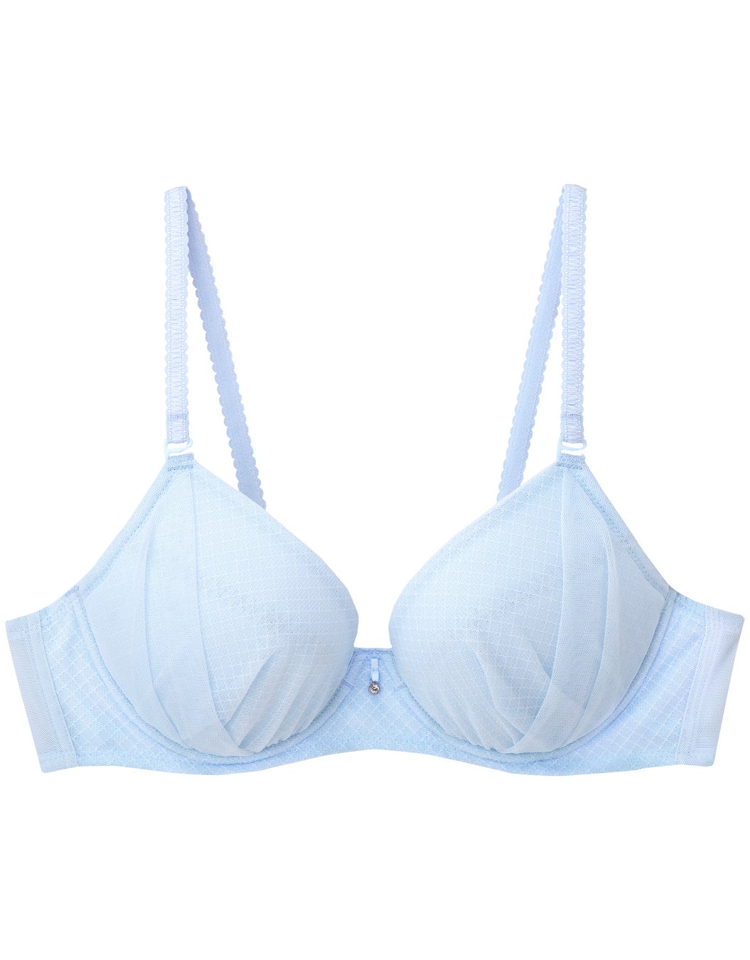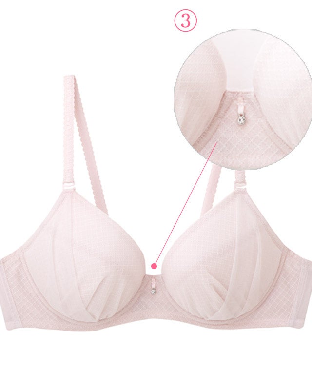 ブラジャー前中心部分のワイヤーをなくし、ワイヤーの痛さを感じにくい設計を採用しています。