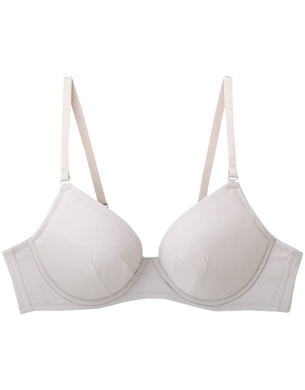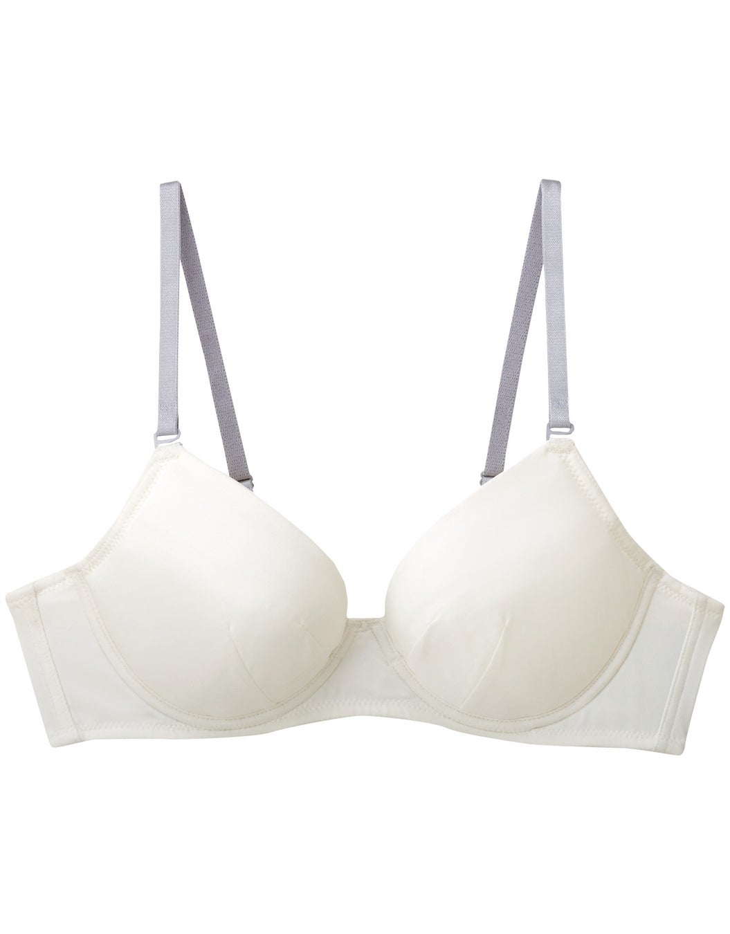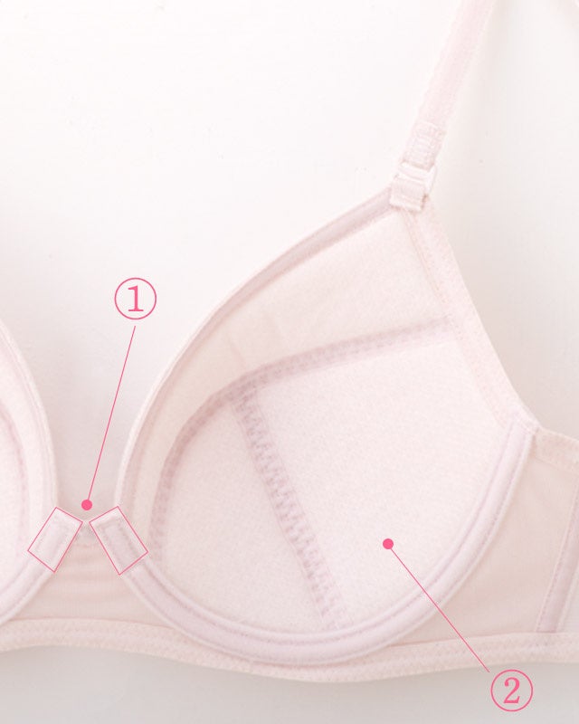 カップ部分には広めのワイヤーを使用し、やわらかい素材で成長期のバストをふんわり包みます。さらに、前中心部分の伸び止め素材が浮きや圧迫感を軽減しながら美しいバストラインをキープ。バック部分にはほどよいサポート感のある素材を使い、バストをきちんと支えます。