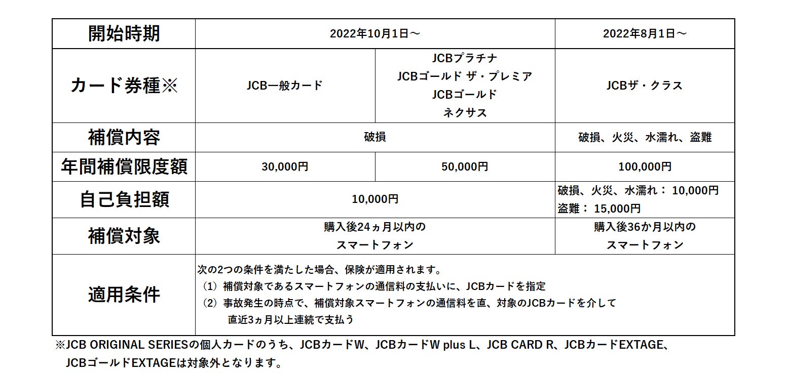 株式会社ジェーシービー(本社:東京都港区、代表取締役会長兼執行役員社長:浜川一郎、以下:JCB)は、Chubb損害保険株式会社(本社:東京都品川区、代表取締役社長:ディエゴ・ソーサ、以下「チャブ保険」という)が提供する「スマートフォン保険」(以下「JCBスマートフォン保険」という)をJCB ORIGINAL SERIESの個人カード付帯サービスとして提供を開始しました。