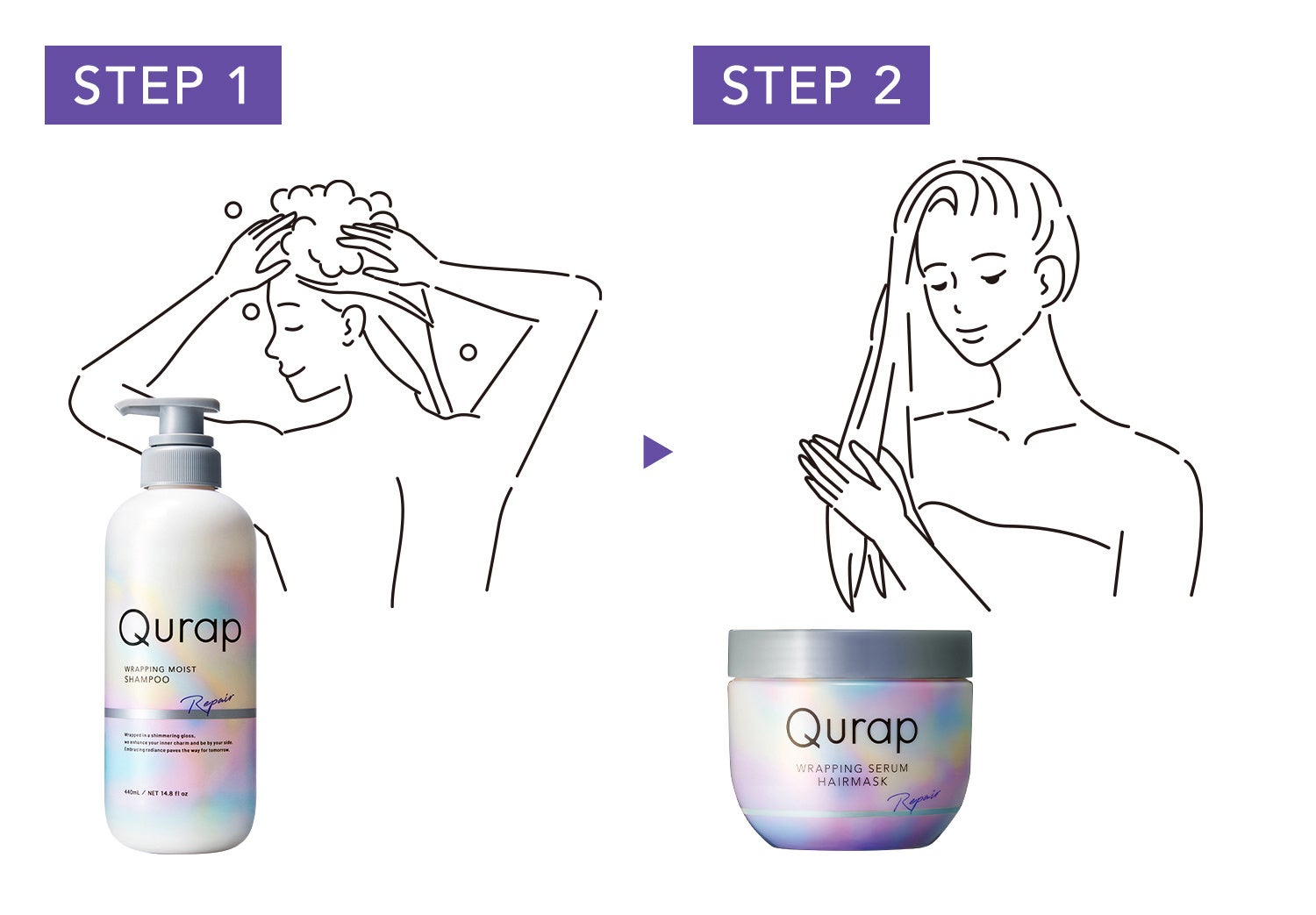 既存のシャンプー&トリートメントと同様に、ツヤ膜ラッピングを表現。