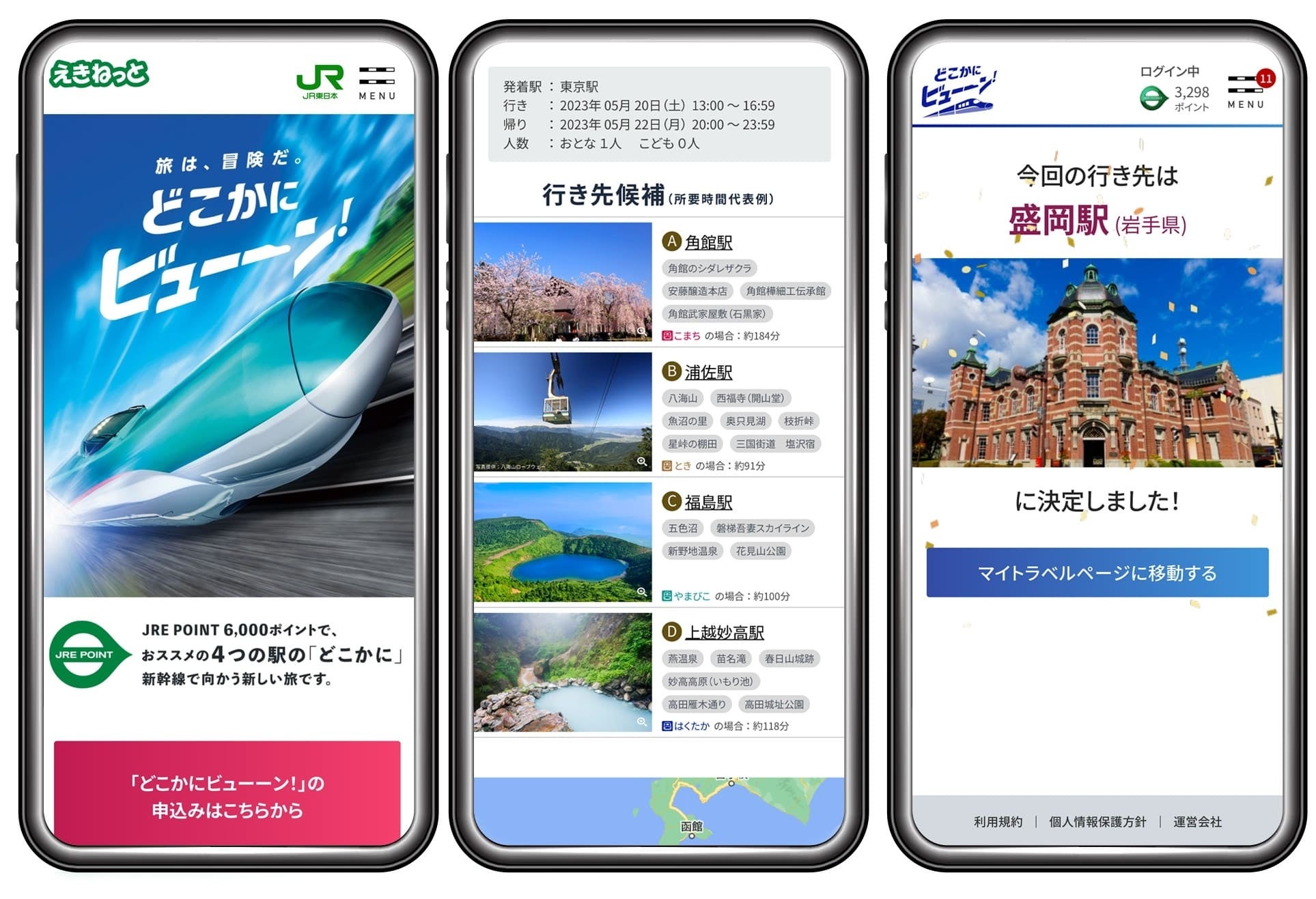 ■旅行サービス【どこかにビューーン!】は、JR東日本がおすすめする新幹線停車駅の中から「どこかに」行ける新しいサービスです。お客さまが旅程情報を入力すると、4つの行き先候補が表示されます。好みの組み合わせが表示されたら、JRE POINT6,000ポイントを利用して申し込みいただき、最終的な行き先は申込から3日以内に案内されます。お客さまが行き先を決定できないことによる思いがけない旅行体験の創出、旅行需要喚起と地域活性化に貢献している点が評価されました。