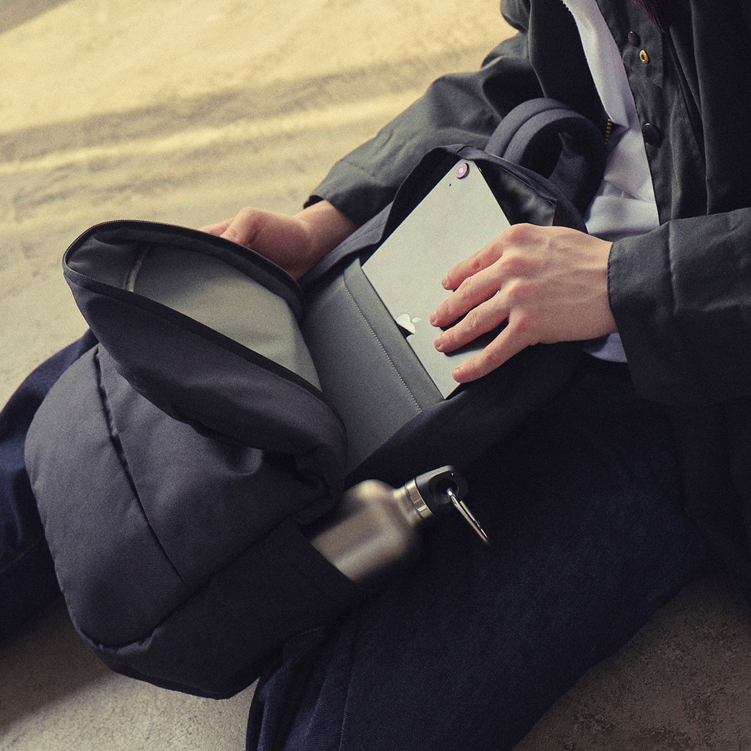 シティライフに最適なスリングデザインは、見た目以上に多機能。メインコンパートメントは、充電ケーブルやイヤホンなどを整理できるメッシュポケットやパッド入りポケット、キーフック、AirTagポケットなど、ガジェットポーチとしての機能も充実。バックパネルは、起毛裏地付きのポケットが配備され、スマートフォンなど小型デバイスを傷や衝撃から守り、安心して持ち運べる。