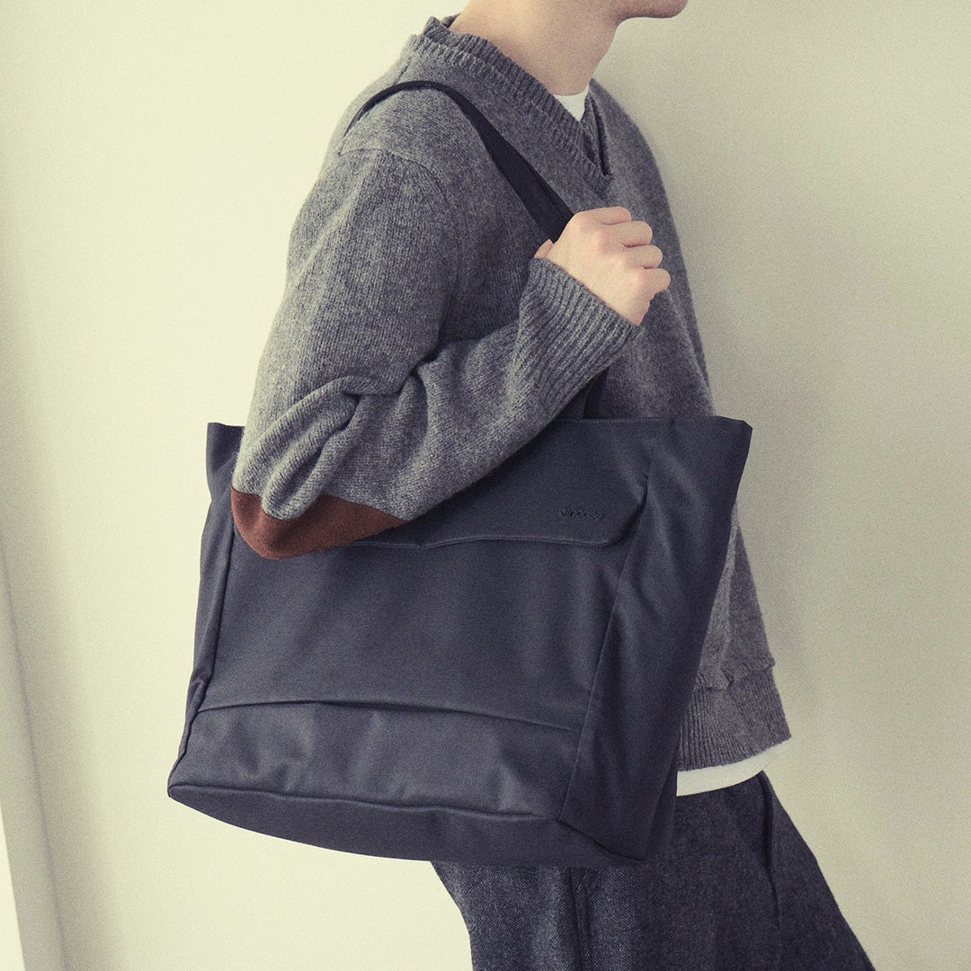 天ファスナーで閉じられる大型トートバッグ。メインコンパートメントは、ノートPC用テックコンパートメントに加えて、ドリンクボトルや折り畳み傘などを収納できる2つのメッシュポケットや2つのアクセサリーポケットを備え、整理収納のしやすさが魅力。キャリーバー取り付けストラップにより、移動も快適です。