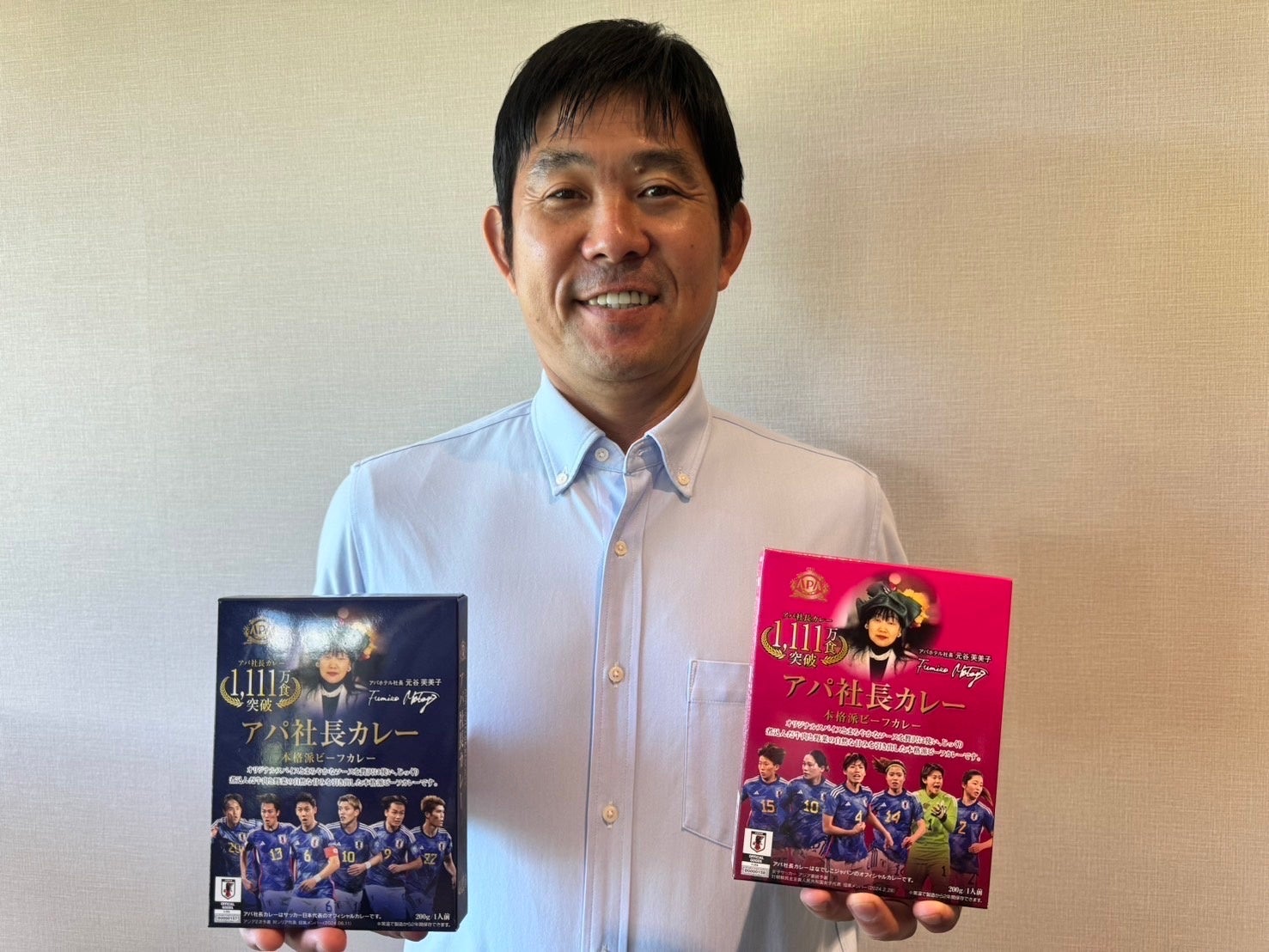 JFAナショナルチームパートナーとして、昨年3月からサッカー日本代表をサポートいただいているアパホテルさんに、この度、従来のホテルビジネス領域に加え、「アパ社長カレー」と「アパ社長ごはん」の商品を通じてもサッカー日本代表を応援していただけることになりました。今回、1,111万食を超えるヒット商品であるアパ社長カレーで日本代表の選手写真を使用した新たなパッケージの商品もご用意いただいていると聞いています。今回の取り組みは、ファンサポーターのみなさんに新たな楽しみを提供してもらえるものと大変期待しています。