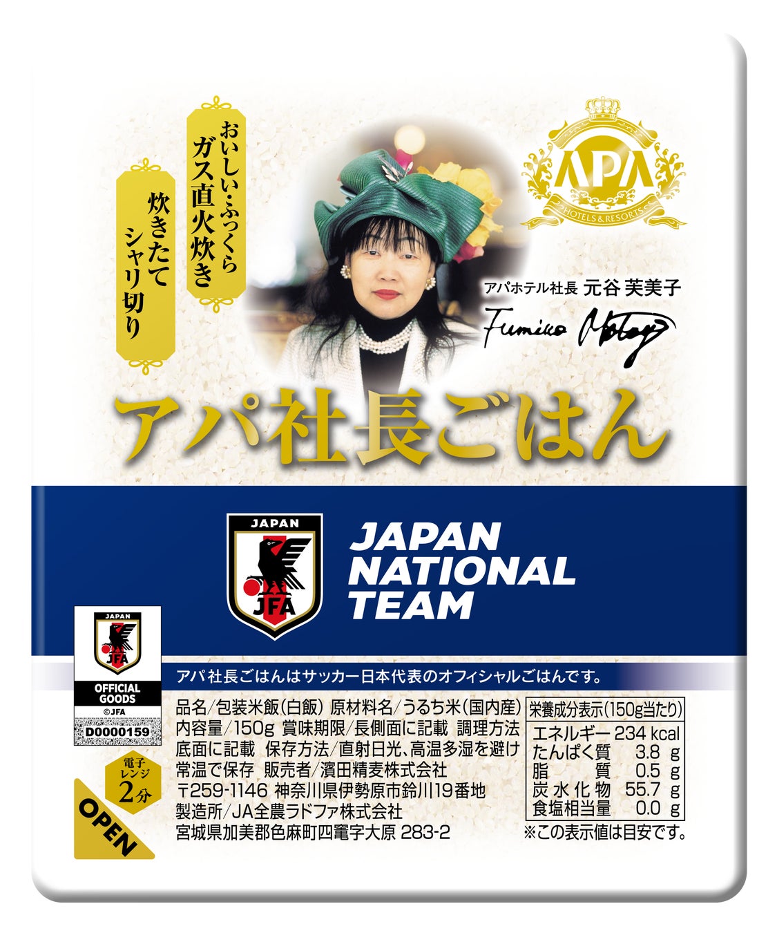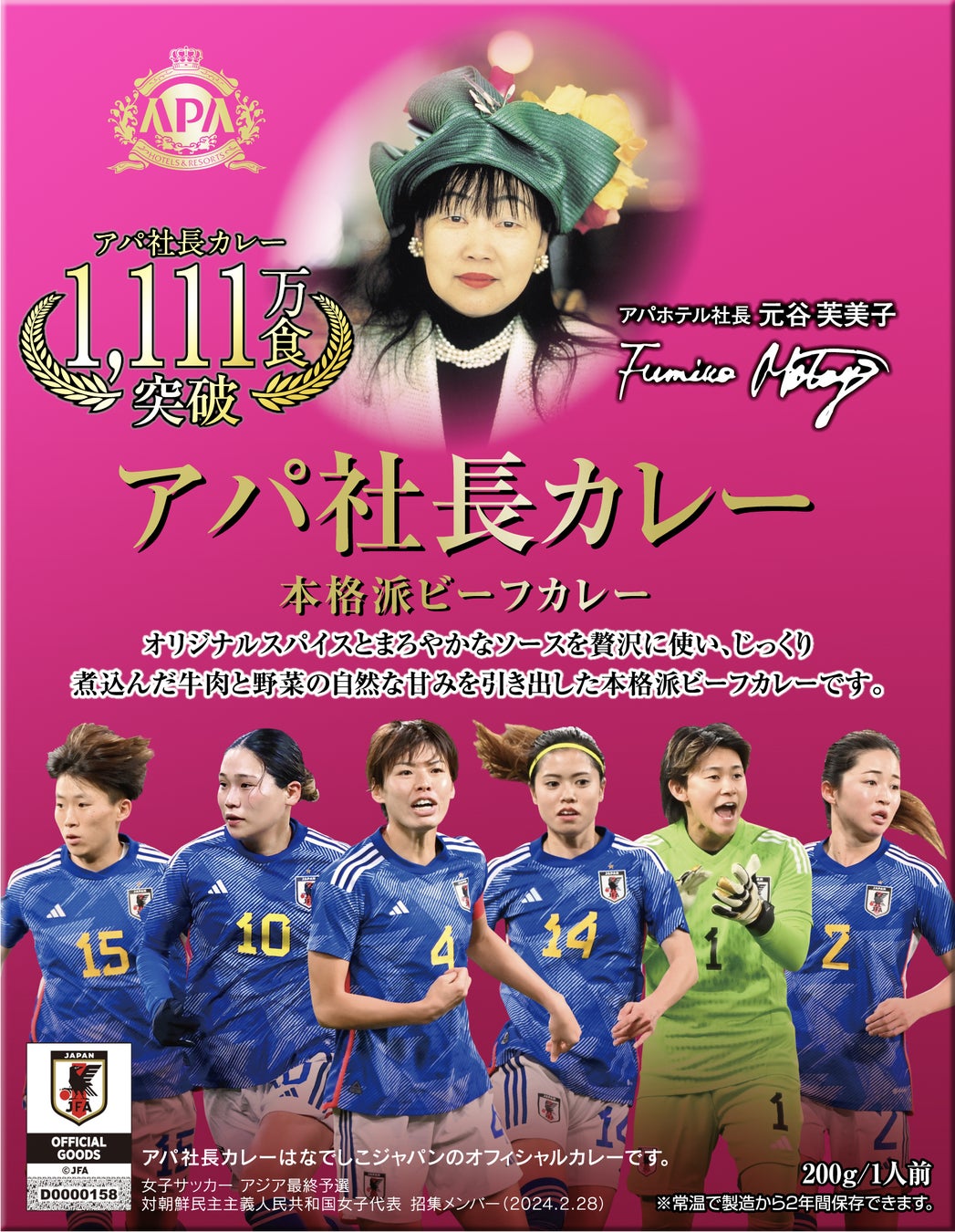 アパホテルネットワークとして全国最大の857ホテル124,884室(建築・設計中・海外・FC・アパ直参画ホテルを含む)を展開するアパホテル株式会社(本社:東京都港区赤坂3丁目2‐3 社長 元谷 芙美子)は、JFAナショナルチームパートナーとして、公益社団法人日本サッカー協会(JFA)と契約を締結し、累計販売数1,000万食を突破したアパホテルブランドのカレー「アパ社長カレー」がサッカー日本代表オフィシャルカレーとなることが決定しました。また、アパ社長カレーと合わせる「アパ社長ごはん(包装米飯)」もサッカー日本代表オフィシャルごはんに決定し、期間限定のサッカー日本代表パッケージ商品が登場します。