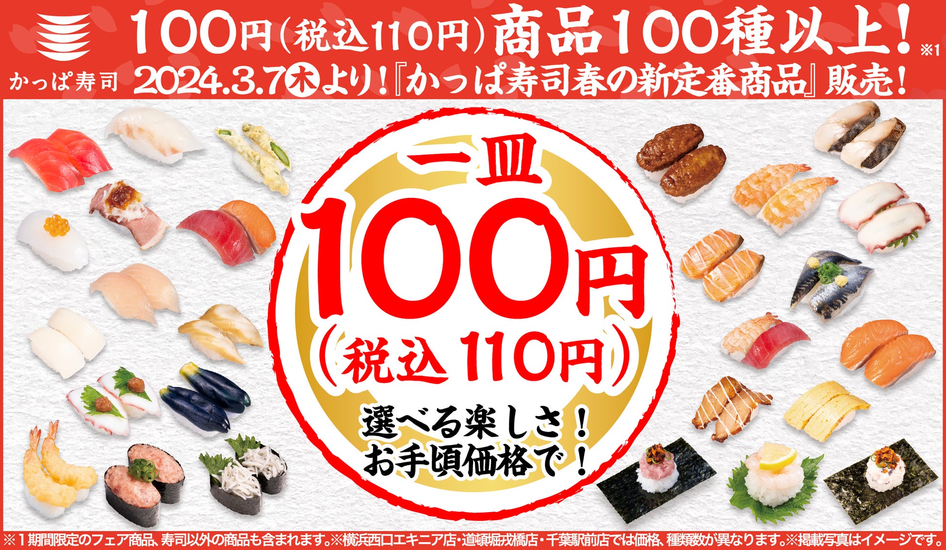 『かっぱの北海道産いくら110円&春の味覚祭り』を3月7日(木)より開催いたします。いくらの生産量日本一を誇る北海道の粒立ちが良くまろやかな味わいのいくらが楽しめる「北海道産いくら包み」を一皿100円(税込110円)でご提供します。さらに、今が旬の「天然さより」や「桜えび」など、見て食べて春を感じていただける商品を一皿100円(税込110円)よりご用意しております。