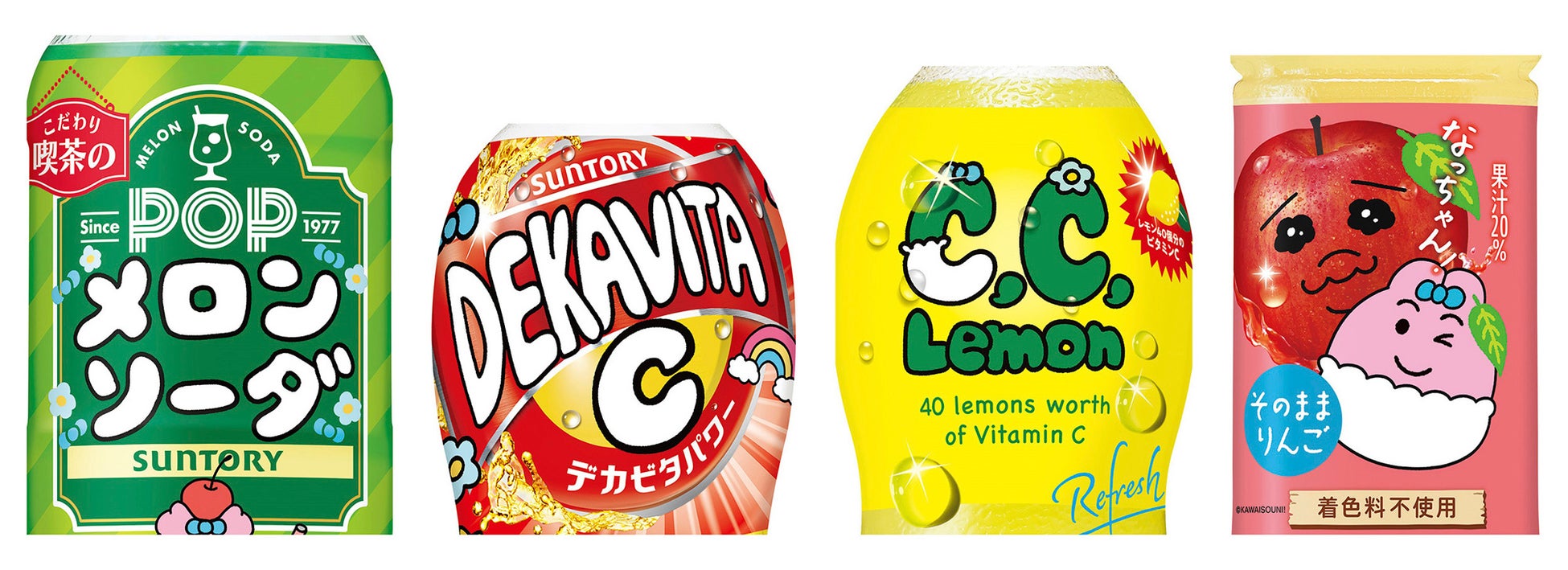 『おぱんちゅうさぎ』『んぽちゃむ』のキャラクターである、「おぱんちゅうさぎ」「んぽちゃむ」「きみまろ」が、サントリーのドリンクの世界に遊びにきたオリジナルデザインで、「POP メロンソーダ」「デカビタパワー」「C.C.レモン」は、パッケージ片面のブランドロゴも特別仕様となっています。また、「なっちゃん りんご」では、3種のうち1種にて、おなじみの「なっちゃん」の顔と「おぱんちゅうさぎ」とが入れ替わっているので、ぜひそちらもご注目ください。