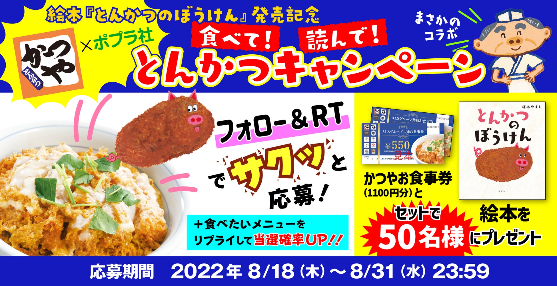 アークランドサービスホールディングス株式会社の⼦会社、とんかつ専⾨店「かつや」を展開している株式会社かつや(本社:東京都千代⽥区/代表:⼤内 勇⼀)は、株式会社ポプラ社(本社:東京都千代田区、代表取締役社長:千葉均)の絵本『とんかつの ぼうけん』の発売を記念して「食べて!読んで!かつや×ポプラ社Twitterコラボキャンペーン‼」を2022年8月18日(木)~8月31日(水)に開催いたします。ポプラ社公式Twitterアカウントをフォロー&かつや公式Twitter公式アカウントのキャンペーンツイートをリツイートすると、抽選で50名様に絵本『とんかつの ぼうけん』と、かつやで使えるお食事券1,100円分をセットでプレゼントいたします。