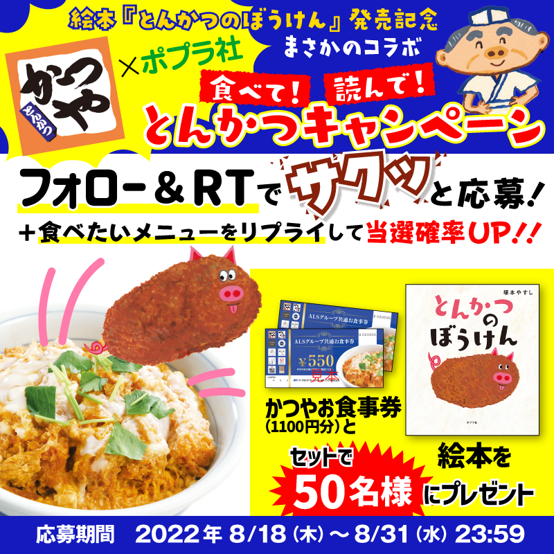 絵本を読んで「とんかつ」が食べたくなった時は、身近で手軽にカツ丼を楽しめるとんかつ専門店「かつや」を思い出していただきたいと考え、ポプラ社公式Twitterアカウントをフォロー&かつや公式Twitterアカウントのキャンペーンツイートをリツイートすると、抽選で50名様に絵本『とんかつの ぼうけん』と、かつやで使えるお食事券1,100円分をセットでプレゼントする「食べて!読んで!かつや×ポプラ社Twitterコラボキャンペーン‼」を2022年8月18日(木)~8月31日(水)に開催いたします。