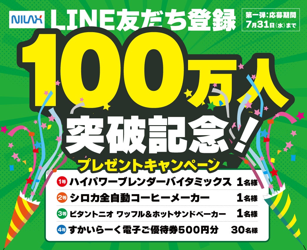 【おしゃれで便利!食卓を彩る家電が当たる?!】バラエティー豊かな食べ放題が楽しめる‟ニラックスブッフェ”にてLINE友だち100万人突破記念!プレゼントキャンペーンを3か月に渡り開催いたします!