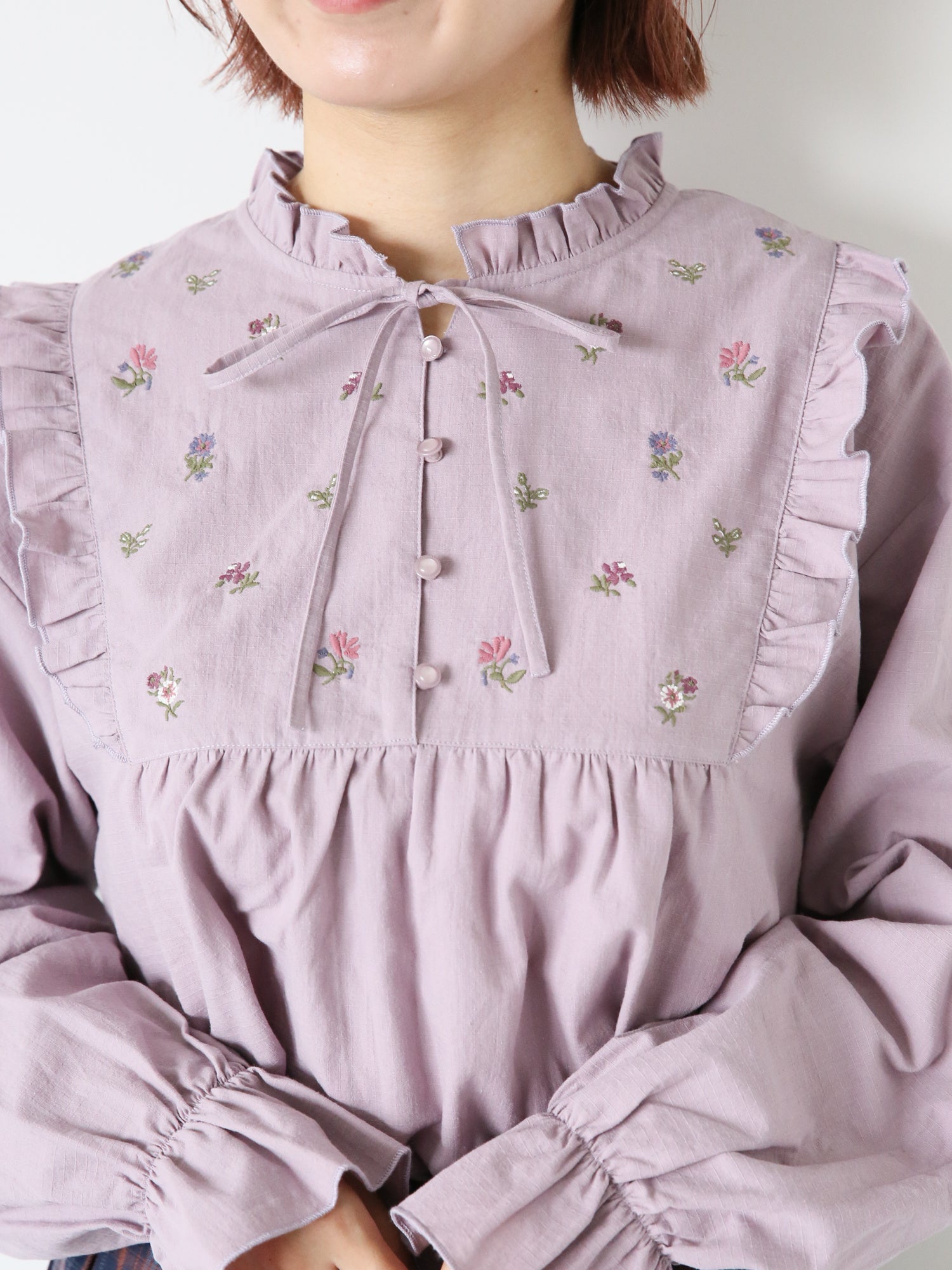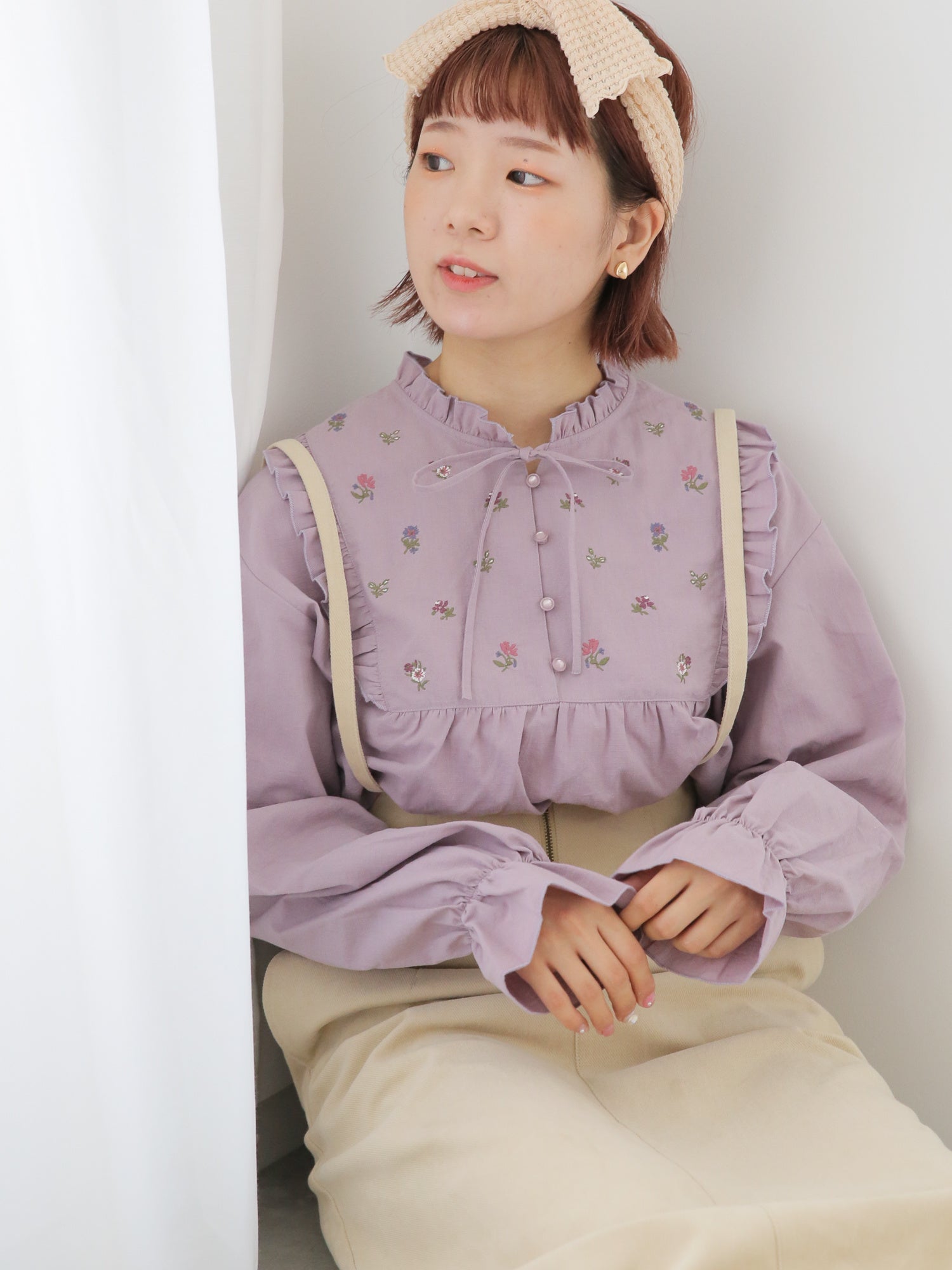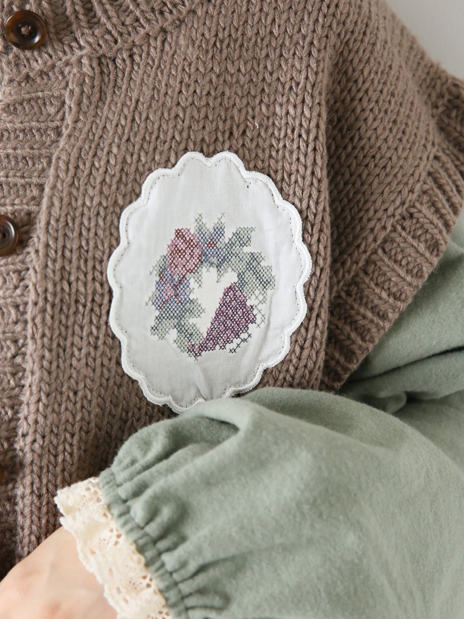フリル切替のブラウスには、3種類の草花の刺繍を胸元に散りばめました。小さな草花たちがほっこりとした柔らかい雰囲気を演出してくれます。その他、着回しがきくニットベストは大きめの刺繍アップリケを配し、レトロな印象に仕上げました。シンプルなカットソーとの組み合わせはもちろん、本コラボのアイテムと一緒に着用いただくのもおすすめです。