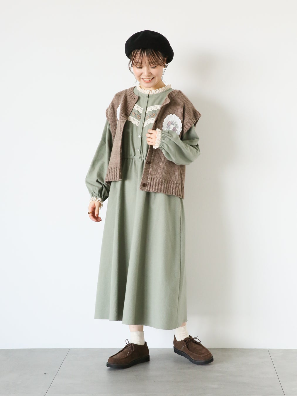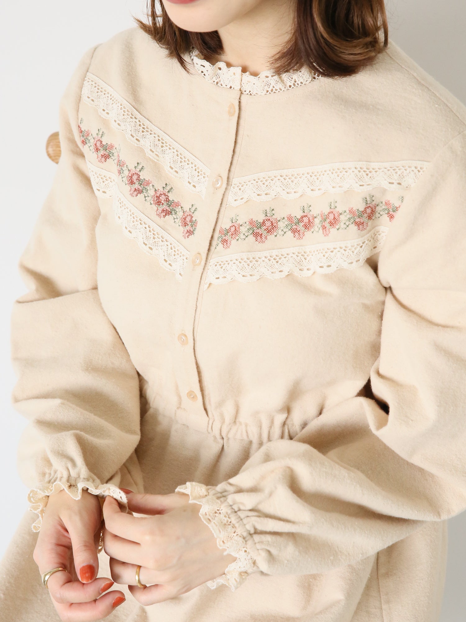 今回は繊細な刺繍やレース、アップリケを取り入れた全3アイテムを展開いたします。ehka sopoの中でも人気の高いワンピースは、秋冬らしい暖かみのある起毛生地にレースとお花の刺繍を胸元に施しました。首周りや袖口にも同じレースをプラスし、1枚で主役になる可愛らしいアイテムです。