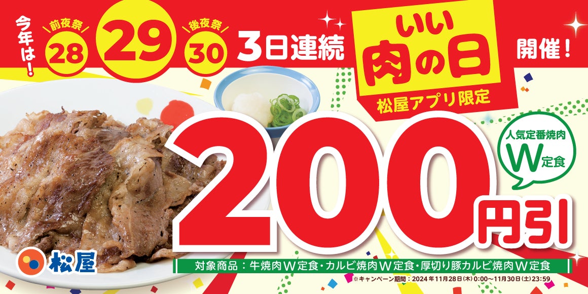 【松屋】\いい肉の日/今年は3日連続開催! 松屋アプリ限定、人気定番焼肉 “ W ” 定食が200円引き!