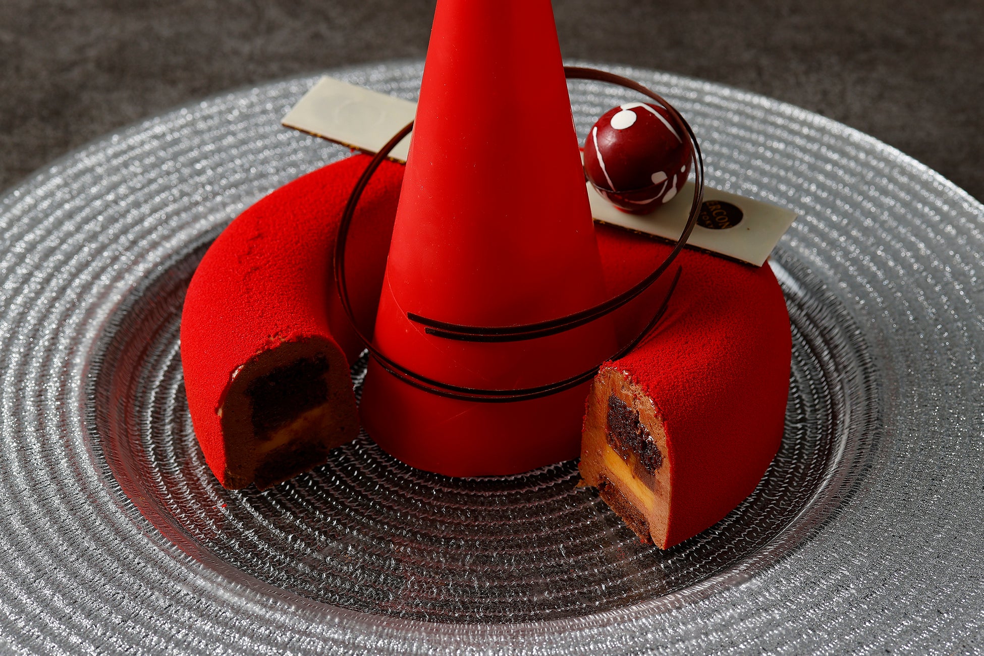 真っ赤に染めたケーキとサンタクロースの帽子をイメージしたスタイリッシュなデザインのケーキは、ほのかにコーヒー香る濃厚なビターチョコレートムースの中にクレーム ブラッドオレンジと濃厚なガトーショコラが入っており、大人なサンタクロースを表現しました。