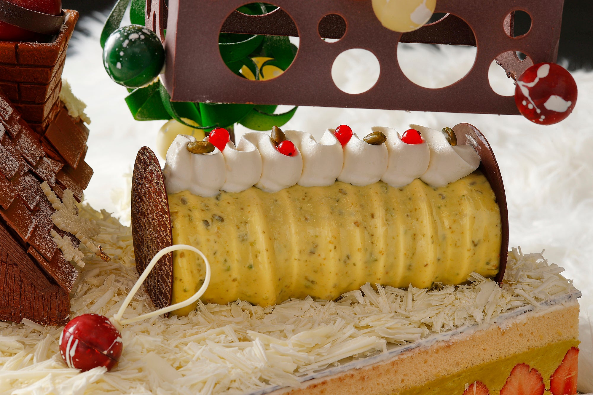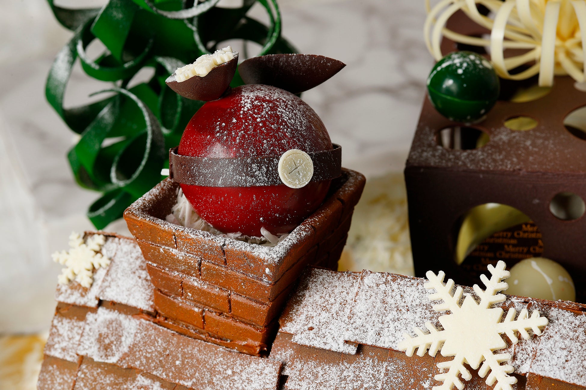 さらに、10セット限定の「Ho! Ho! Ho! ~あわてんぼうのサンタクロース~」は、サンタクロースがプレゼントをお家に届ける際に足を滑らせて煙突に突っ込んでしまったストーリーを表現したユーモア溢れるシェフの自信作です。大人数でのパーティーにふさわしい華やかなフレジェには、イタリア産ピスタチオのプラリネを使用。さらにその上に、ライチゼリーとグロゼイユを包んだ自家製ピスタチオプラリネの濃厚ムースケーキをのせ、特大プレゼントをイメージしたチョコレート細工をかぶせることでアート感あふれる立体的な作品に仕上げました。