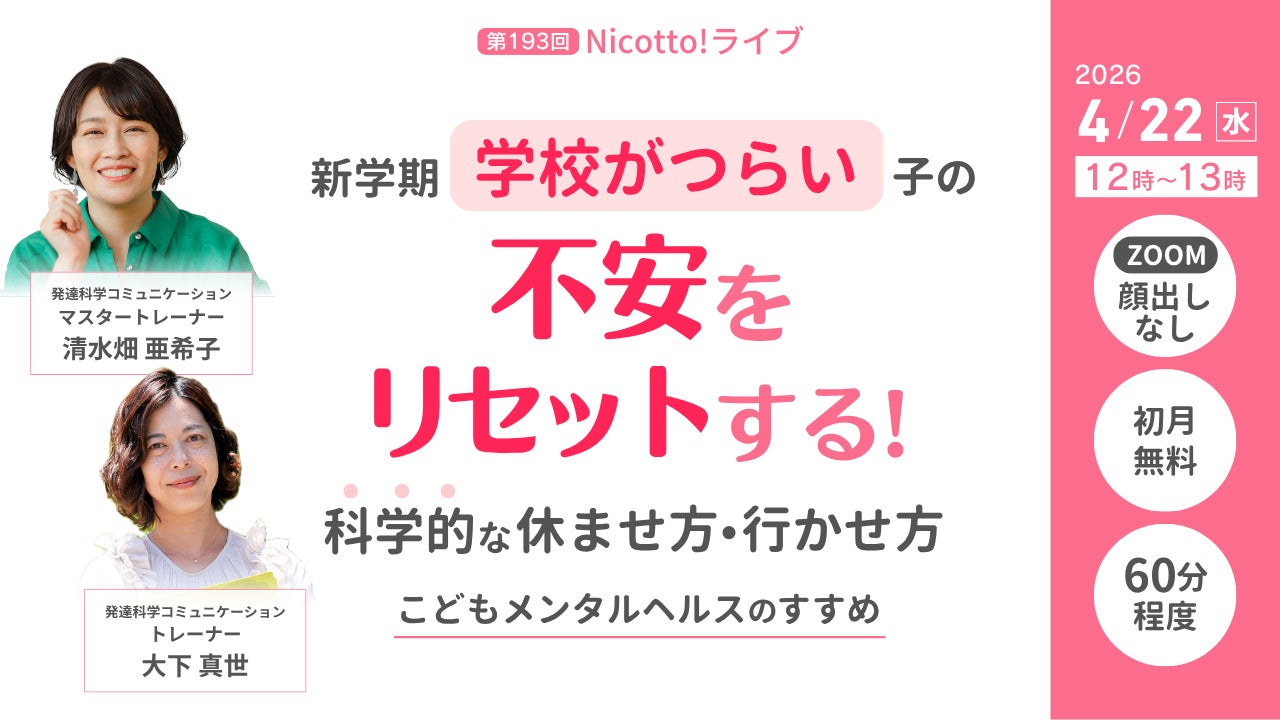 (株)パステルコミュニケーション(本社:東京都豊島区、代表取締役:吉野加容子)が運営する、発達障害・グレーゾーンの子どもを育てるママがいつでも学べて相談できるオンライン子育て塾「Nicotto!塾」は、2026年4月22日(水)お昼12時より、「新学期 学校がつらい子の不安をリセットする!科学的な休ませ方・行かせ方」をテーマにオンラインライブを開催いたします。