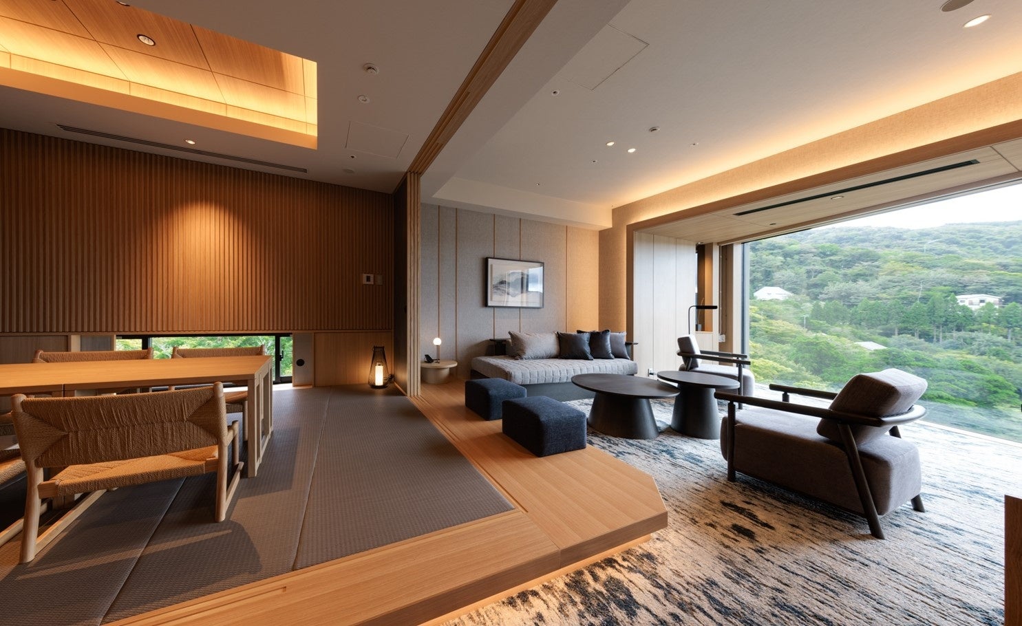 本施設は「心まで解き放つ、美しき碧き世界へ」をコンセプトとし、広大な湖を一望できる開放感と爽やかな緑に包まれる平穏を大切に、お客様ひとりひとりに特別なひと時をご提供いたします。全客室に半露天風呂を備えお好きなときにプライベートな空間で温泉やバイブラバスをお楽しみいただけるほか、リビングからは芦ノ湖方面が望めるよう窓を斜めにデザインし開放感を創出。箱根の雄大な自然を存分に享受でき、時間ごとに移り変わる風景を満喫いただけます。また、東急ハーヴェストクラブ初となるダイニングスペースも備えた 120 ㎡超のペットスイート客室もご用意。ペットと一緒に楽しめるドッグガーデンも併設しております。