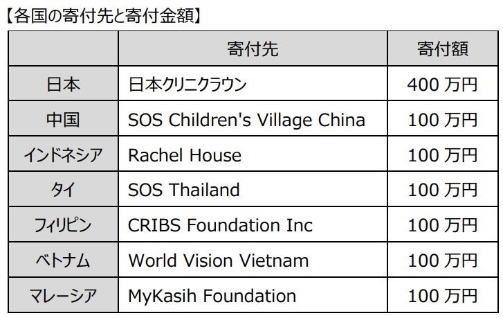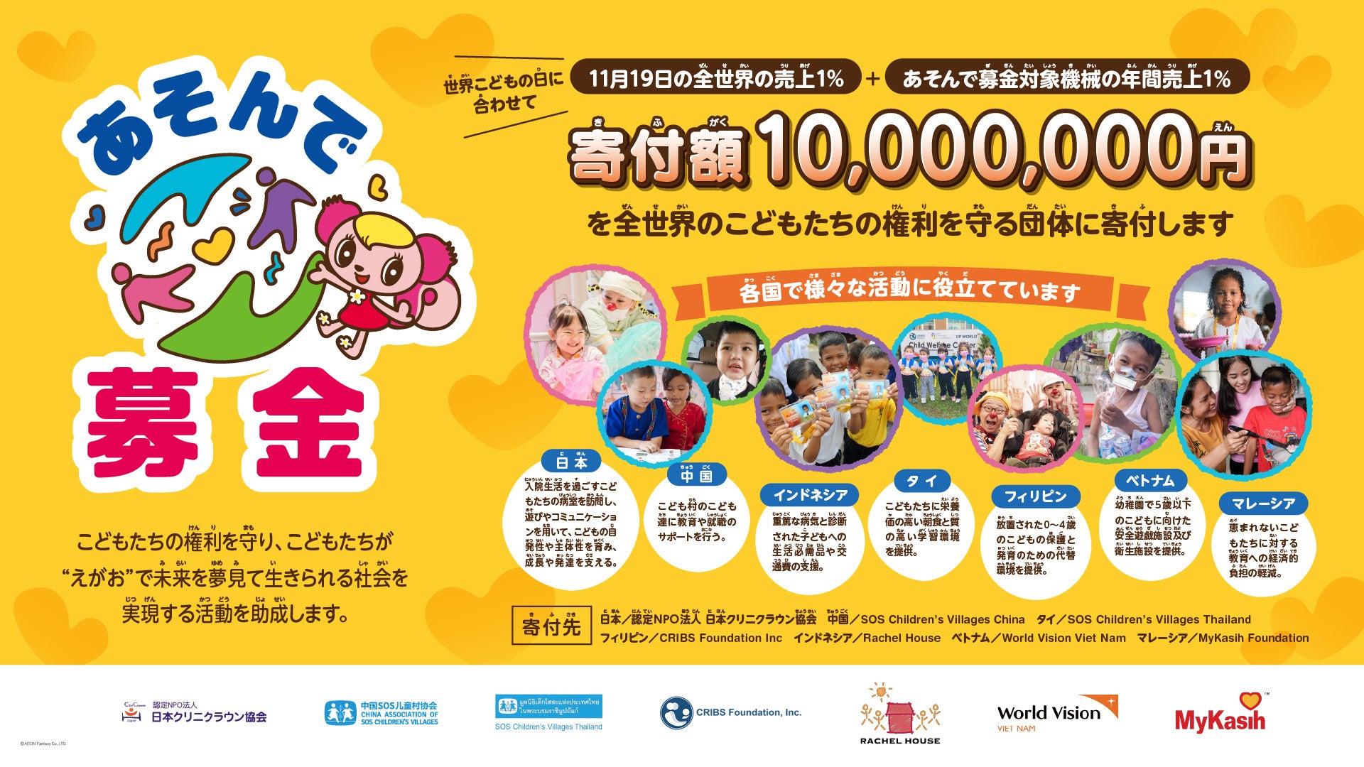 株式会社イオンファンタジー(本社:千葉県千葉市、代表取締役社長:藤原徳也、以下、当社)は、世界中のこどもの権利を守るために、世界1,136店舗の当社アミューズメント施設、プレイグラウンド施設での売上の一部を「あそんで募金」として1,000万円を世界7か国のこども支援活動団体へ寄付いたします。