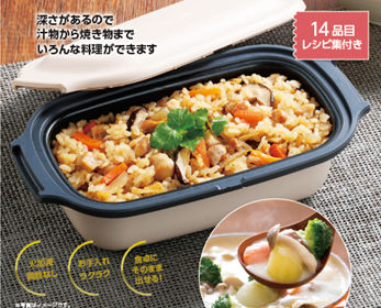 本製品は、約5cmの深型設計。お味噌汁やシチュー、カレーなどの汁物づくりにぴったりです。さらに、約10分でお米(1合)の炊飯も可能。お弁当用のごはん作りにも重宝します。そのほか、焼きそばや天ぷらの温めなど、多彩な料理にお使いいただけます。