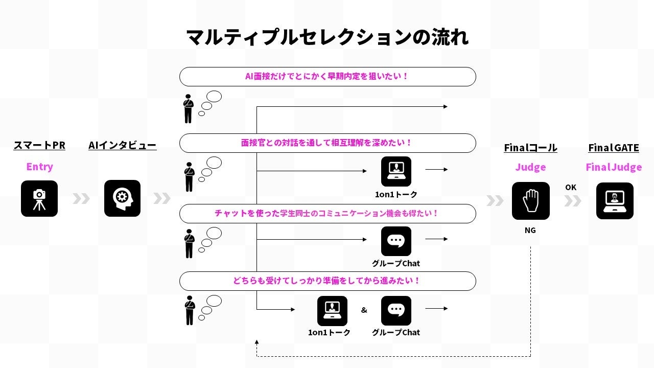 上述の「スマートPR」から「Finalコール」をするまで、好きな面接官と好きなテーマで話せる「1on1トーク」や、チャットでのグループディスカッションを行う「グループChat」など、多岐にわたる選考を用意し、それらを学生自身が自由に選択できる選考フローの総称です。