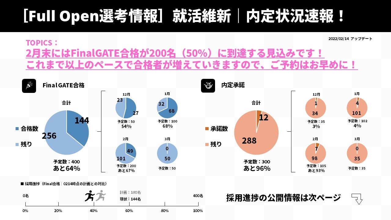 「Full Open選考情報」は、これまで非開示としていた、選考参加者数・最終面接の合格数・内定承諾数などの選考進捗情報を、学生のみなさまに常時公開し続ける新たな施策です。採用活動において、企業は学生のみなさまから非常に多くの重要な情報をお預かりしていますので、企業も重要な採用進捗・選考情報を開示することで、当社グループが掲げる “就職活動において企業と学生は常にフェアであるべき”という採用ポリシーを、より具現化することができると考えております。